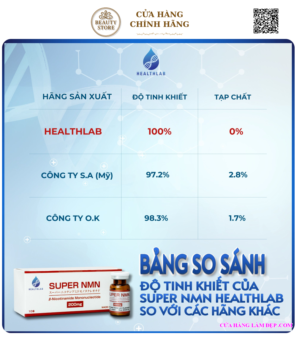 - Cam kết về nguồn gốc: Sự an toàn của Super NMN của Health Lab đã được xác nhận trong một nghiên cứu lâm sàng được thực hiện tại Đại học Hiroshima. Bên cạnh đó, hệ thống quản lý sản xuất tại nhà máy được chứng nhận GMP và môi trường hoàn toàn vô trùng bằng phương pháp khử trùng khí ozone được cấp bằng sáng chế độc đáo