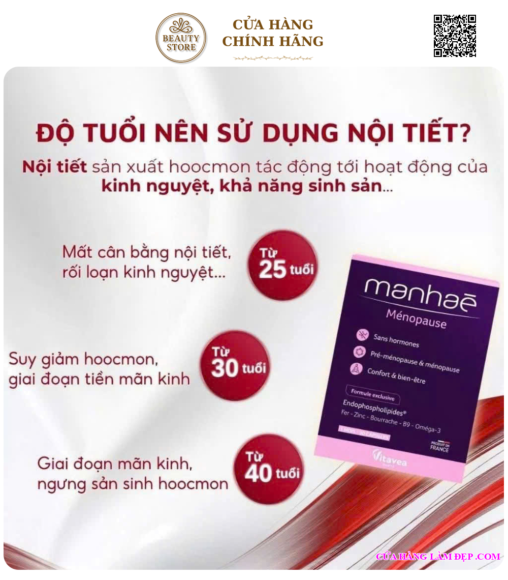 Manhaé được đánh giá cao bởi khả năng hỗ trợ cải thiện các triệu chứng như: bốc hỏa, đổ mồ hôi đêm, khô hạn, rối loạn giấc ngủ, giảm ham muốn, khô da và rụng tóc. Đây là lựa chọn phù hợp cho phụ nữ muốn bổ sung nội tiết tố theo cách tự nhiên, an toàn, không dùng hormone tổng hợp.