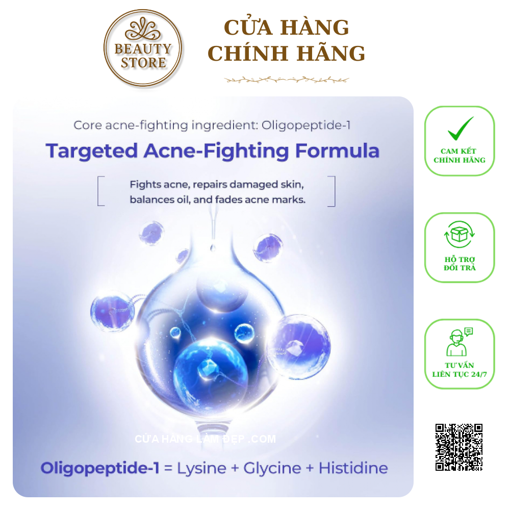 - Công thức phục hồi mụn chính xác: Thành phần chính chống mụn Oligopeptide-1, kết hợp với Lysine, Glycine và Histidine, tăng cường khả năng phục hồi tự nhiên của da, điều trị hiệu quả làn da dễ bị mụn và cải thiện độ đàn hồi và mịn màng.