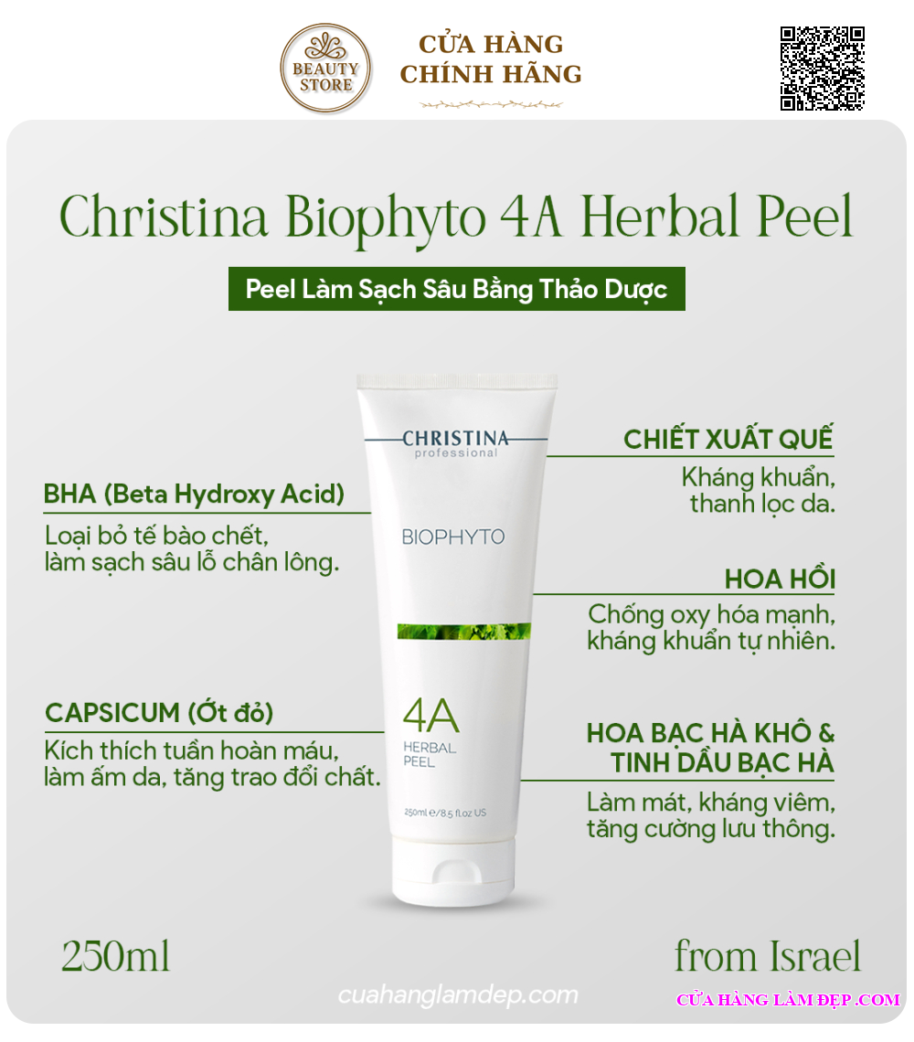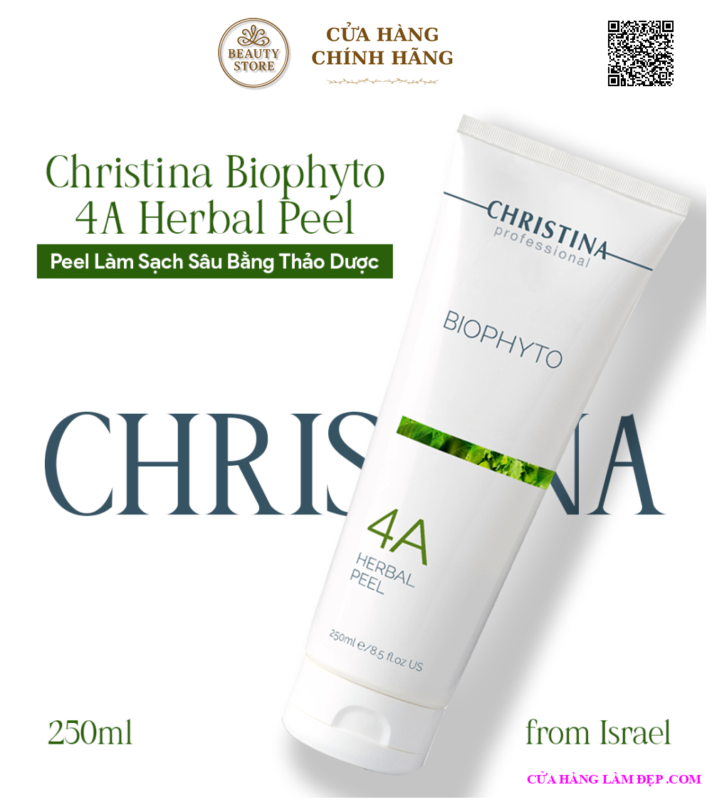 Peel Làm Sạch Sâu Bằng Thảo Dược Christina Biophyto 4A Herbal Peel là sản phẩm cao cấp đến từ thương hiệu dược mỹ phẩm nổi tiếng Israel – Christina. Sản phẩm được thiết kế chuyên biệt để làm sạch sâu, loại bỏ tế bào chết, bã nhờn và độc tố tích tụ lâu ngày trên da. Nhờ sự kết hợp giữa chiết xuất thảo dược thiên nhiên và BHA, sản phẩm không chỉ làm sạch mà còn hỗ trợ tái tạo da, tăng cường lưu thông máu và ngăn ngừa mụn hiệu quả.