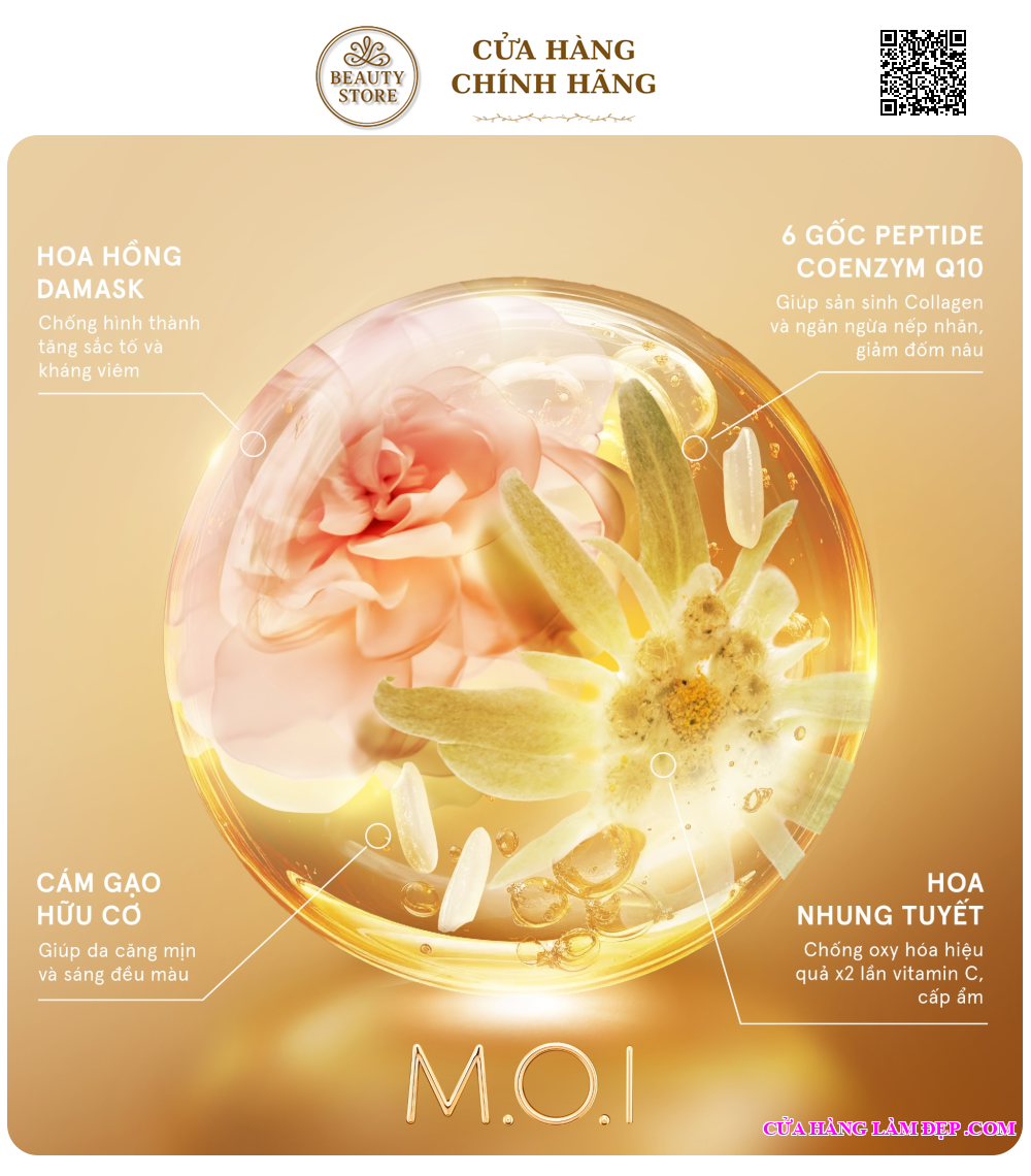 - Bảng thành phần tinh chất “vàng”: Chứa Phức hợp 6 loại Peptides, Coenzym Q10, Niacinamide, chiết xuất chanh, hoa hồng Damask, hoa oải hương, hoa nhung tuyết, cám gạo hữu cơ giúp tái tạo da, kích thích quá trình sản sinh collagen, giảm tình trạng hình thành vết nhăn và sắc tố da, chống lão hoá và củng cố hàng rào bảo vệ da cho da căng mịn, sáng và đều màu hơn.