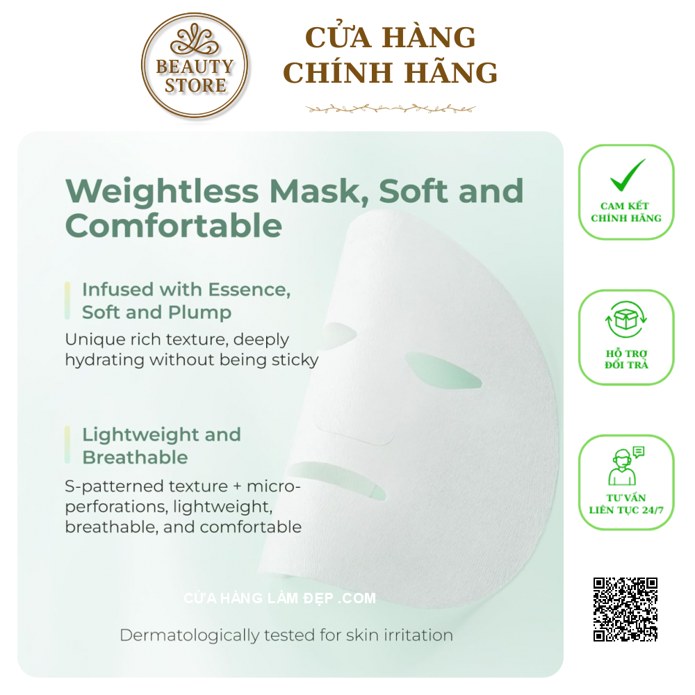 - Nhẹ và dưỡng ẩm, vừa vặn thoải mái: Mặt nạ này có thiết kế thoáng khí, nhẹ, chứa đầy tinh chất để dưỡng ẩm chuyên sâu mà không gây bết dính. Đã được kiểm nghiệm da liễu và an toàn cho da nhạy cảm, bám dính thoải mái trên mặt với cảm giác như không có gì.