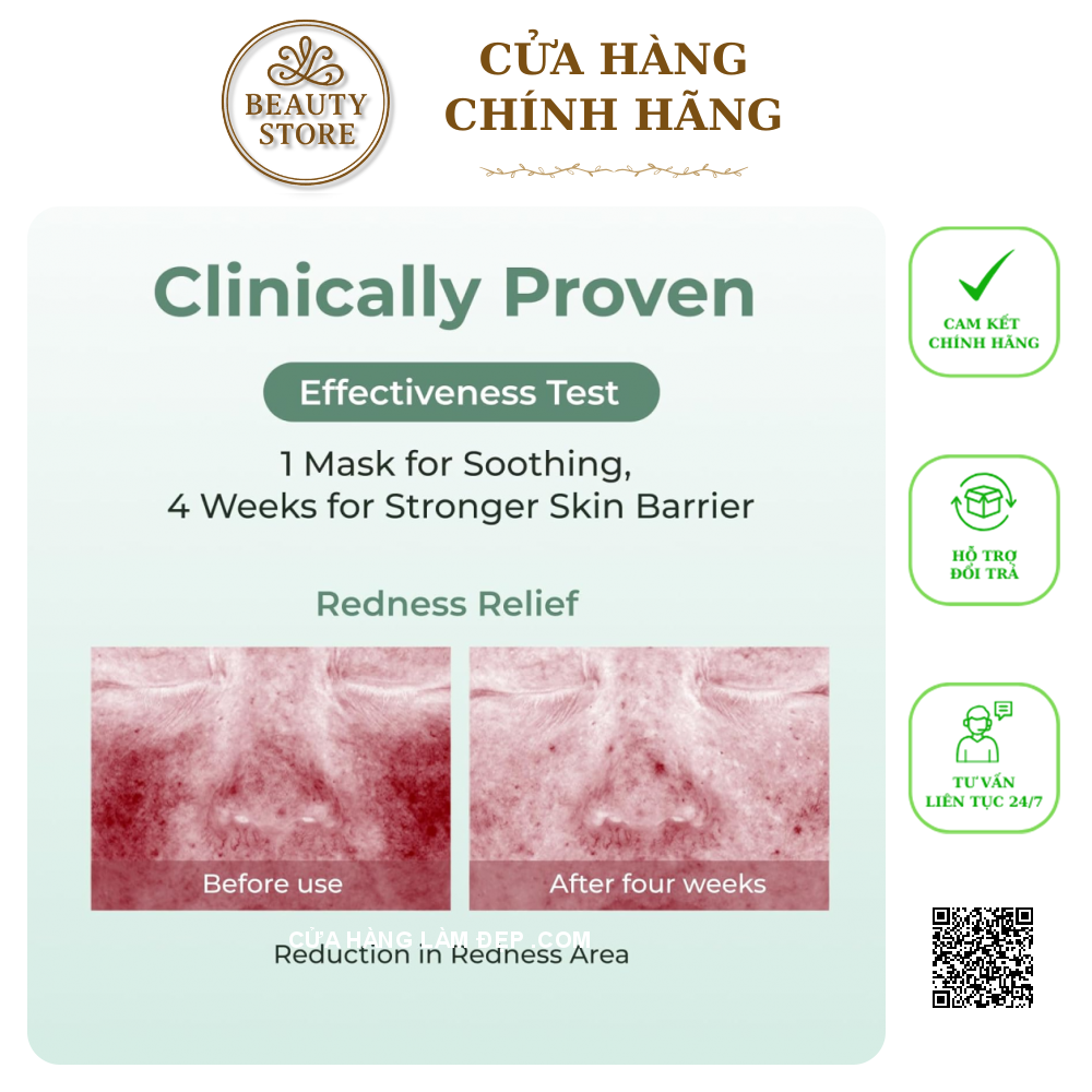 - Một mặt nạ làm dịu tức thì, ổn định trong 4 tuần: Sản phẩm này đã được thử nghiệm khoa học, cho thấy một mặt nạ có thể làm dịu mẩn đỏ trên da, với kết quả ổn định sau 4 tuần sử dụng liên tục. Nghiên cứu cho thấy vùng da đỏ giảm đáng kể, mang lại sự phục hồi và ổn định toàn diện cho da.