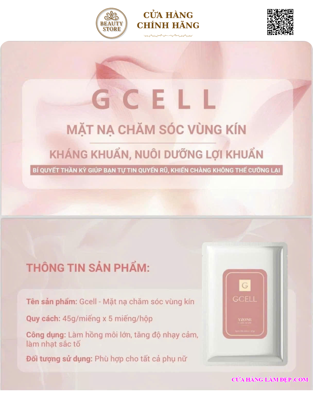 Mặt nạ vùng kín GCell được biết đến với tên gọi GCell YZone Care Mask, là một sản phẩm chăm sóc đặc biệt dành cho vùng nhạy cảm của phụ nữ. Sản phẩm này giúp cung cấp độ ẩm, dưỡng chất và hỗ trợ các vấn đề như khô hạn, cân bằng độ pH và làm săn chắc, mịn màng da vùng kín.