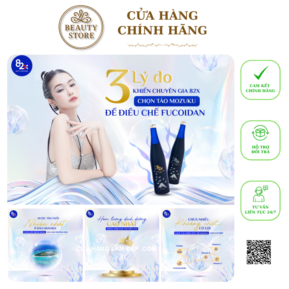 - 82X Fucoidan Collagen & Placenta bổ sung tổ hợp “chiết xuất 82 thực vật lên men + chiết xuất Nấm trắng” giúp nhân đôi hiệu quả miễn dịch và thải độc cho cơ thể.
