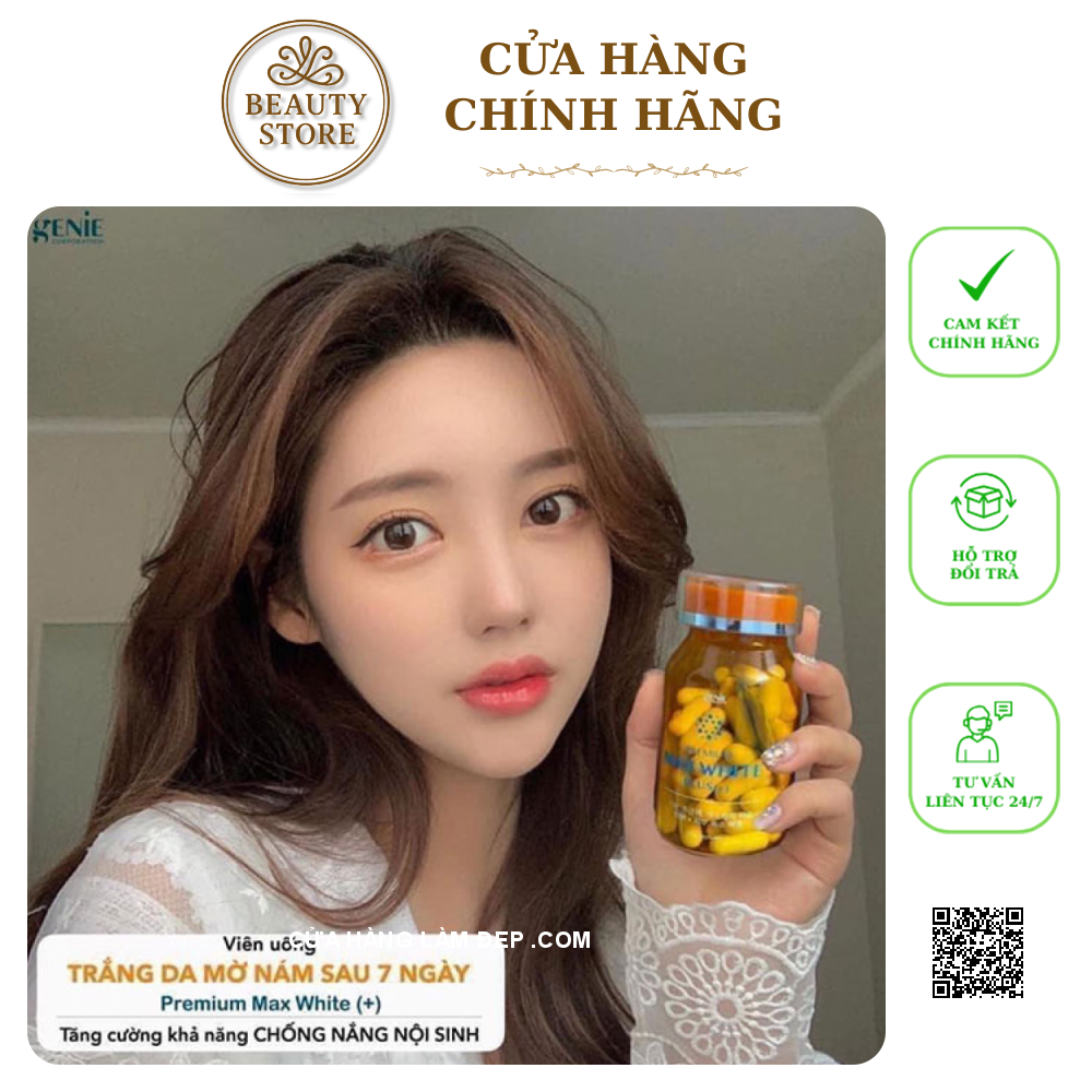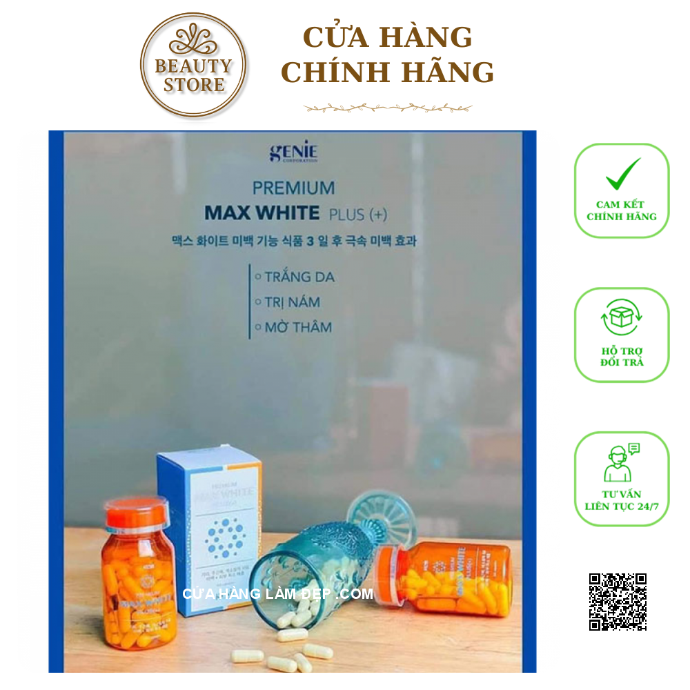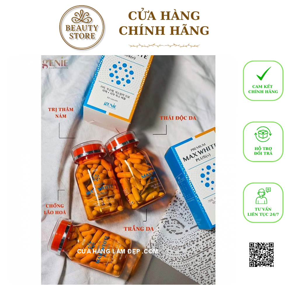 - Viên uống trắng da max white plus genie là phiên bản mới của Genie, có chứa thêm nhiều dưỡng chất. Đặc biệt là hàm lượng glutathione cao mang đến hiệu quả sáng da nhanh.