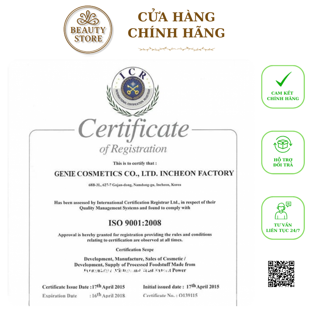 - Mọi sản phẩm của Genie đều được chứng nhận chất lượng từ bộ y tế Hàn Quốc và FDA Hoa Kỳ. Để viên uống trắng da đến tay người tiêu dùng, sản phẩm bắt buộc phải trải qua các bước kiểm tra nghiêm ngặt.