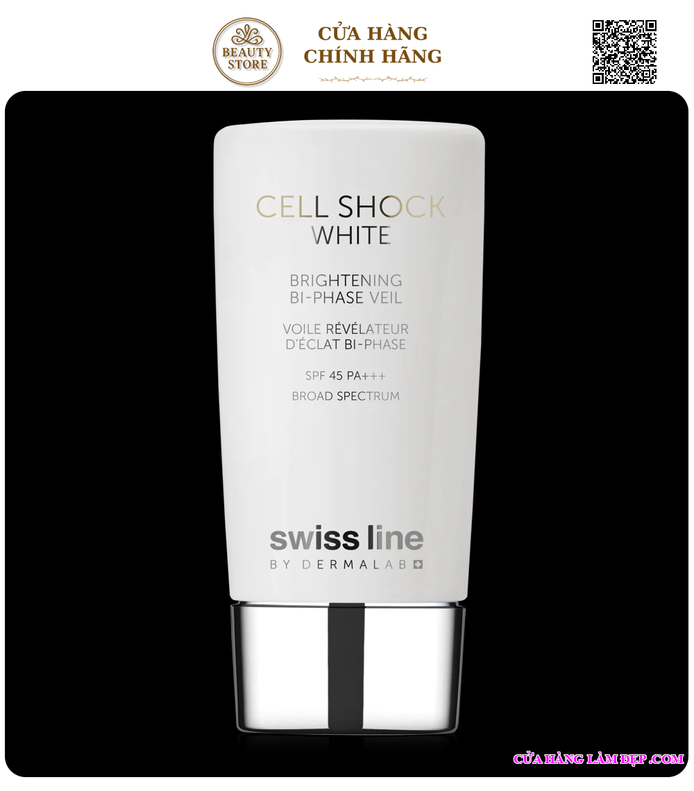 Nhũ Tương Bảo Vệ Và Làm Trắng Da Swissline Cell Shock White Brightening Bi-Phase Veil SPF 45 PA+++ có xuất xứ từ Thuỵ Sĩ.
