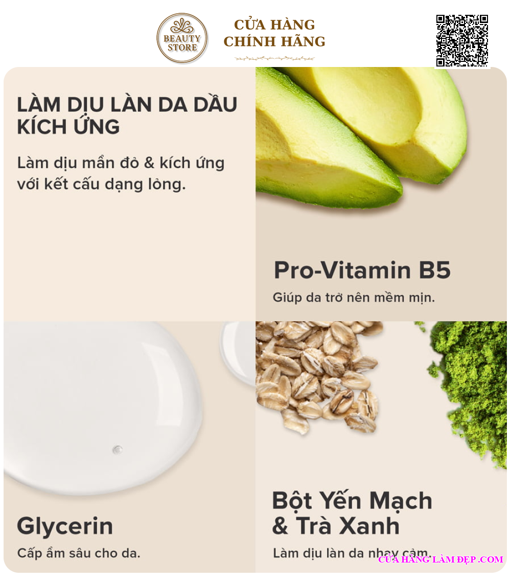 - Giúp làm dịu làn da dầu nhạy cảm, da mất nước, loại bỏ tình trạng mẩn đỏ dị ứng khó chịu và lưu lại trên da cảm giác thoải mái, mềm mượt.