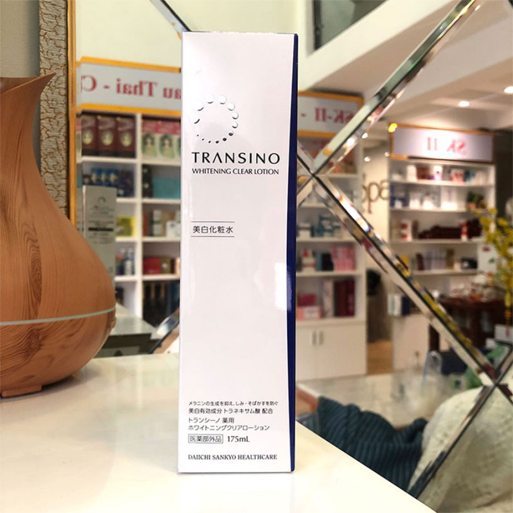 Nước hoa hồng Transino Whitening Clear Lotion - 175ml Đóng gói: 175ml / chai Sản xuất: Daiichi Sankyo Pharmaceutical Co, Ltd – Nhật Bản Không chỉ tối mà đối với chị em phụ nữ, làn da luôn là điểm nhấn đầu tiên thu hút mọi sự chú ý của các chàng. Vậy làm thế nào để có làn da trắng sáng một cách tự nhiên? Đó là điều khiến không ít chị em phải băn khoăn. Bởi sự ảnh hưởng của môi trường tự nhiên như ánh nắng mặt trời, cách sinh hoạt hay sự lão hóa của tuổi tác, sự thay đổi nội tiết tố nữ,… Vậy có phương pháp gì giúp chị em loại bỏ vết nám một cách nhanh chóng, hiệu quả và an toàn hay không. Để đáp ứng được nhu cầu làm đẹp của chị em, các chuyên gia hàng đầu trong lĩnh vực làm đẹp của Nhật Bản đã cho ra đời sản phẩm nước hoa hồng transino whitening clear lotion trị nám hiệu quả nhất. Cùng với những tác dụng này, nước hoa hồng Transino(Transino whitening clear lotion) còn bổ sung thêm thành phần collagen, giúp hỗ trợ tối đa cho da bạn trong việc chống lại các dấu hiệu lão hóa đồng thời giúp nuôi dưỡng da mang lại làn da căng mịn. Đặc biệt ngoài tác dụng trên nước hoa hồng Transino còn đem lại sự trắng sang cùng sự trẻ trung cho làn da của bạn.