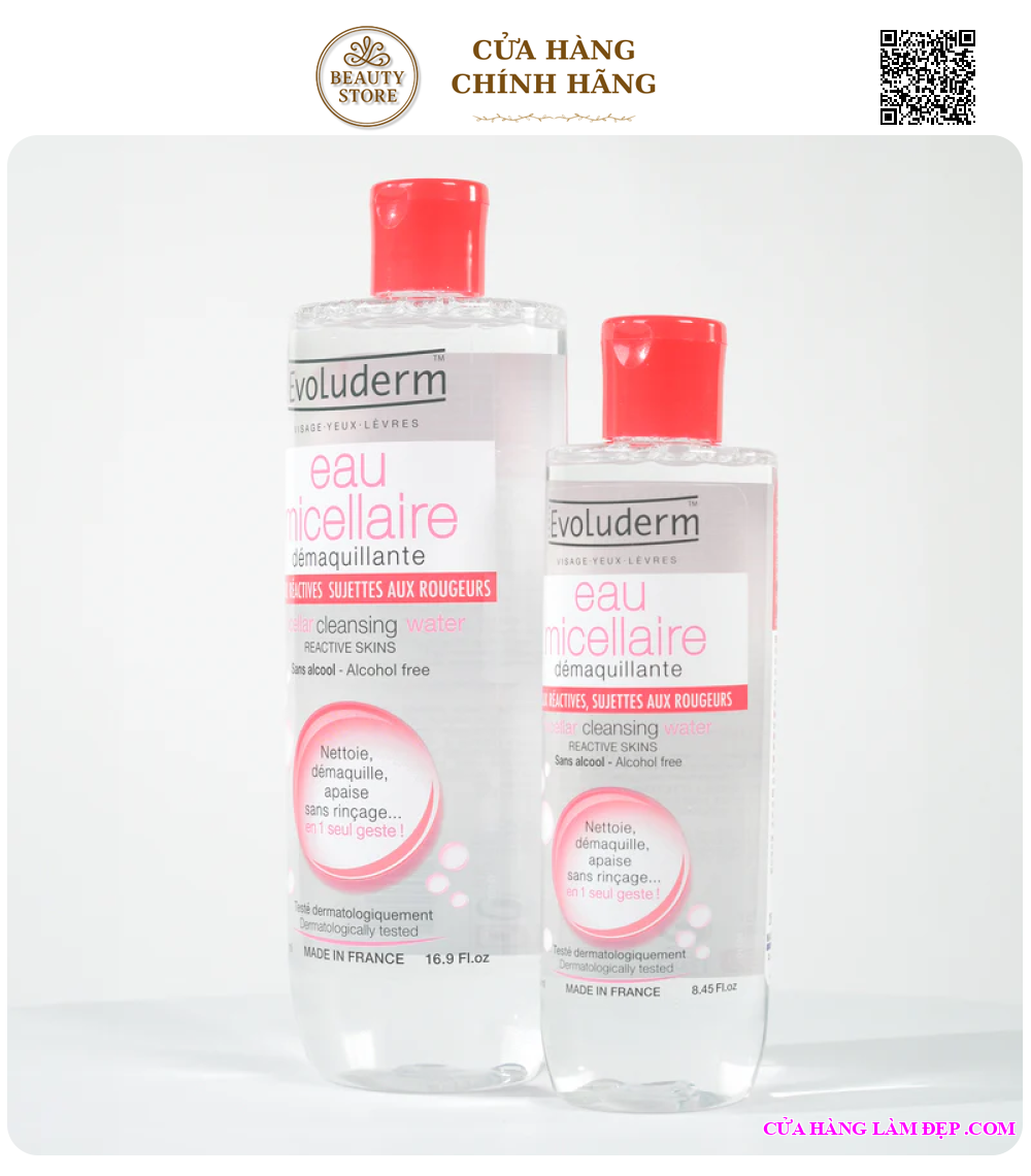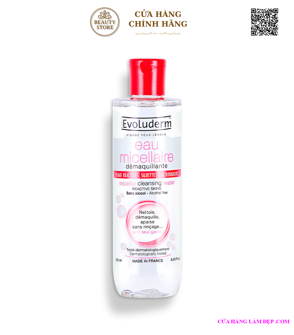 Nước tẩy trang Evoluderm Micellar Cleansing Water – Reactive Skin là sản phẩm làm sạch dịu nhẹ đến từ thương hiệu mỹ phẩm Pháp Evoluderm, được thiết kế chuyên biệt cho làn da mẫn cảm, dễ kích ứng và thường xuyên bị mẩn đỏ. Với công nghệ Micellar Water tiên tiến, sản phẩm giúp loại bỏ lớp trang điểm, bụi bẩn và dầu thừa mà không gây khô rát hay tổn thương da.