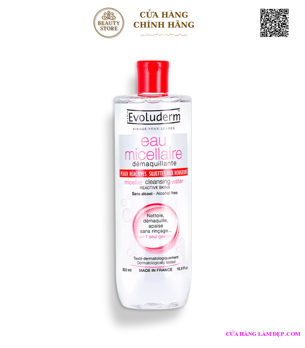 Nước tẩy trang Evoluderm Micellar Cleansing Water – Reactive Skin là sản phẩm làm sạch dịu nhẹ đến từ thương hiệu mỹ phẩm Pháp Evoluderm, được thiết kế chuyên biệt cho làn da mẫn cảm, dễ kích ứng và thường xuyên bị mẩn đỏ. Với công nghệ Micellar Water tiên tiến, sản phẩm giúp loại bỏ lớp trang điểm, bụi bẩn và dầu thừa mà không gây khô rát hay tổn thương da.