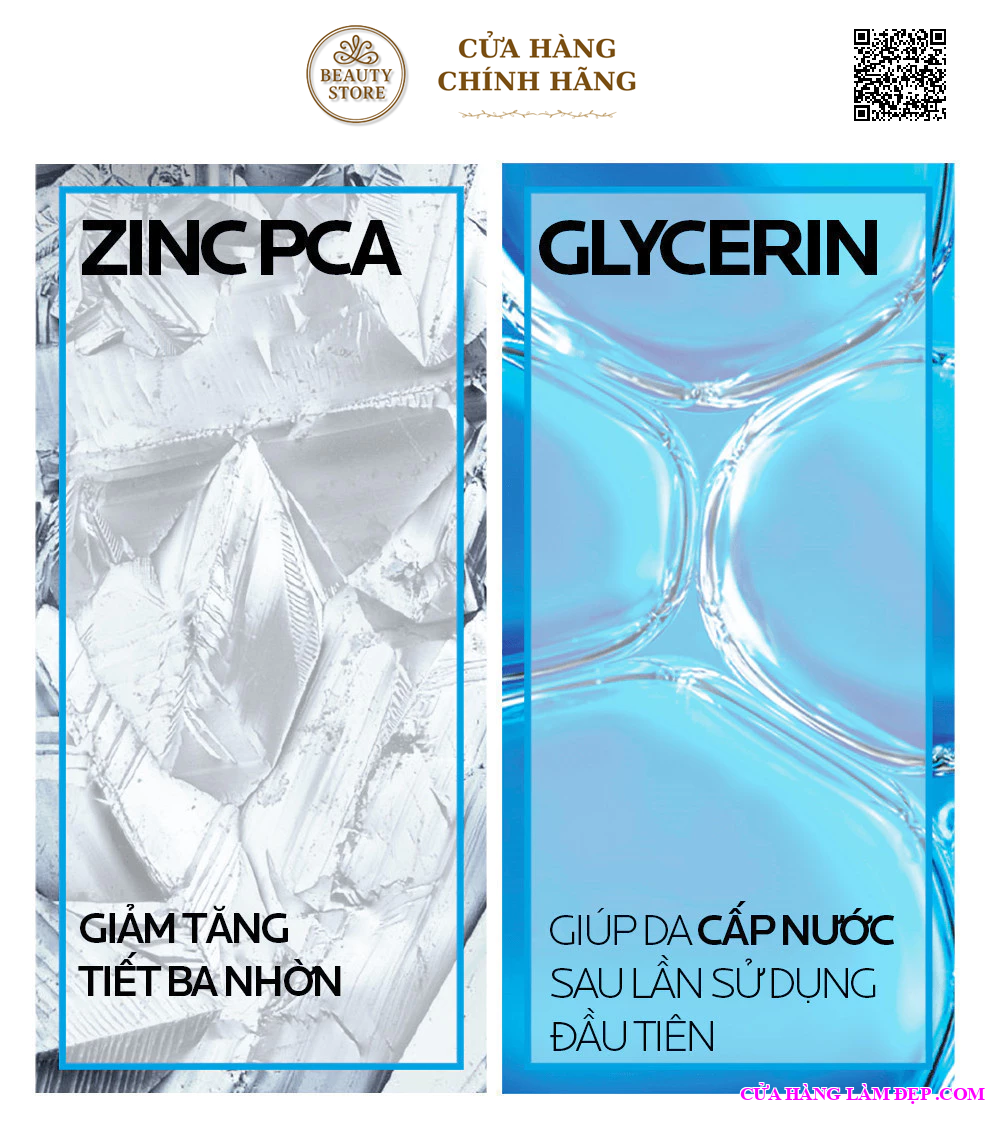 Zinc PCA (Kẽm): Kiểm soát dầu, giảm bã nhờn, hỗ trợ ngăn ngừa mụn.
