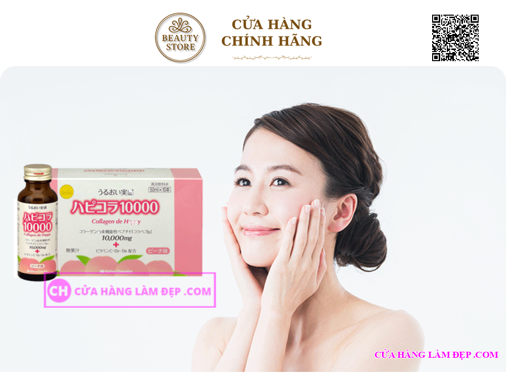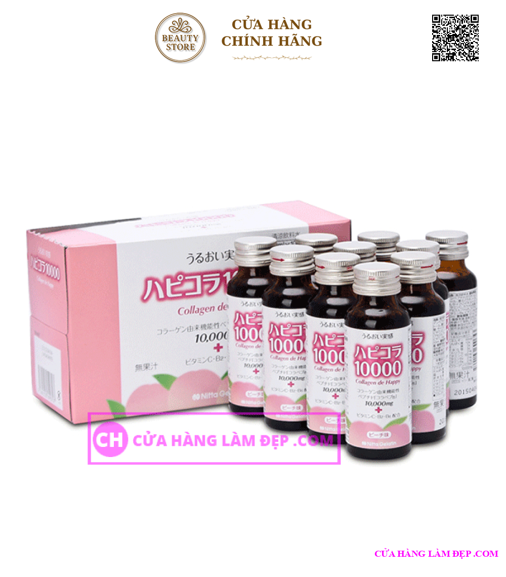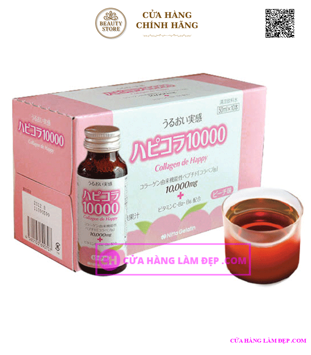 Collagen de Happy Bổ sung 10,000mg Collagen Peptide còn nguồn gốc từ heo có khả năng hấp thụ cao, không chỉ mang lại độ săn chắc và độ ẩm cho da mà còn được xác nhận là có tác dụng cải thiện bệnh khớp và loãng xương. Đặc biệt, nước uống có vị chua ngọt, thanh mát của đào, không nhiều calo nên người giảm cân có thể dùng được.