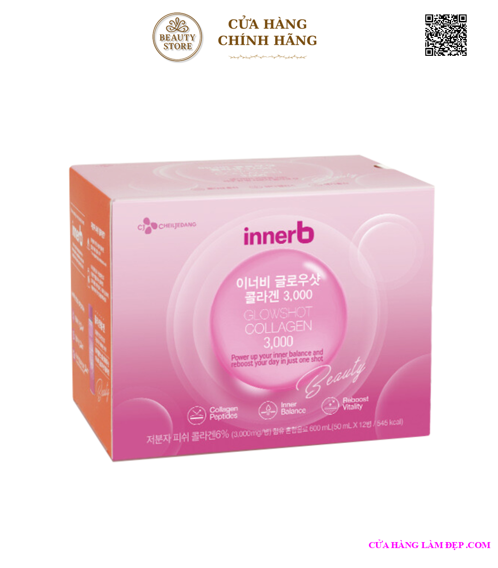 - Nước uống Innerb Glowshot Collagen 3000mg bổ sung collagen và vitamin giúp da căng mịn, tươi sáng