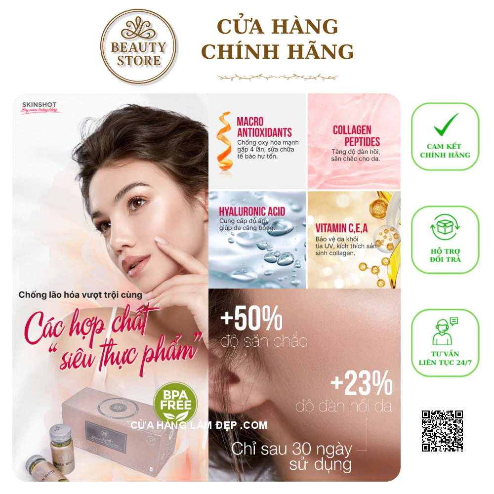 Nước Uống Skinshot Đẹp Da Hỗ Trợ Ngừa Lão Hóa nổi bật với công dụng Hỗ Trợ Ngừa Lão Hóa, bảo vệ và hồi sinh làn da, bay nám trắng hồng. Với công thức độc đáo chất chống oxy hoá cực đại (Macro_antioxidants) đã được đăng ký độc quyền tại Châu Âu, SkinShot đem lại hiệu quả tuyệt vời cho làn da phụ nữ, đó là sự thúc đẩy tổng hợp collagen tự nhiên và duy trì độ đàn hồi cho da. Sau khi ra mắt thị trường và tính đến thời điểm hiện tại, SkinShot là dòng sản phẩm chăm sóc da hàng đầu được giới làm đẹp Châu Âu ưa chuộng. Còn ở Việt Nam, sau 7 tháng ra mắt, SkinShot đã khiến cho các chị em từ phân vân về một thương hiệu mới tới “nghiện” đến mức uống mấy tháng trời vẫn chưa dứt! Có rất nhiều khách hàng đã tin dùng và đạt được hiệu quả ngoài mong đợi, đặc biệt là các nghệ sĩ như diễn viên Kim Lý, diễn viên Trương Ngọc Ánh, diễn viên Kim Tuyến, ca sĩ Tiêu Châu Như Quỳnh, hot Khác blogger Yumi Dương… Là những người rất kỹ tính khi lựa chọn sản phẩm chăm sóc sắc đẹp.