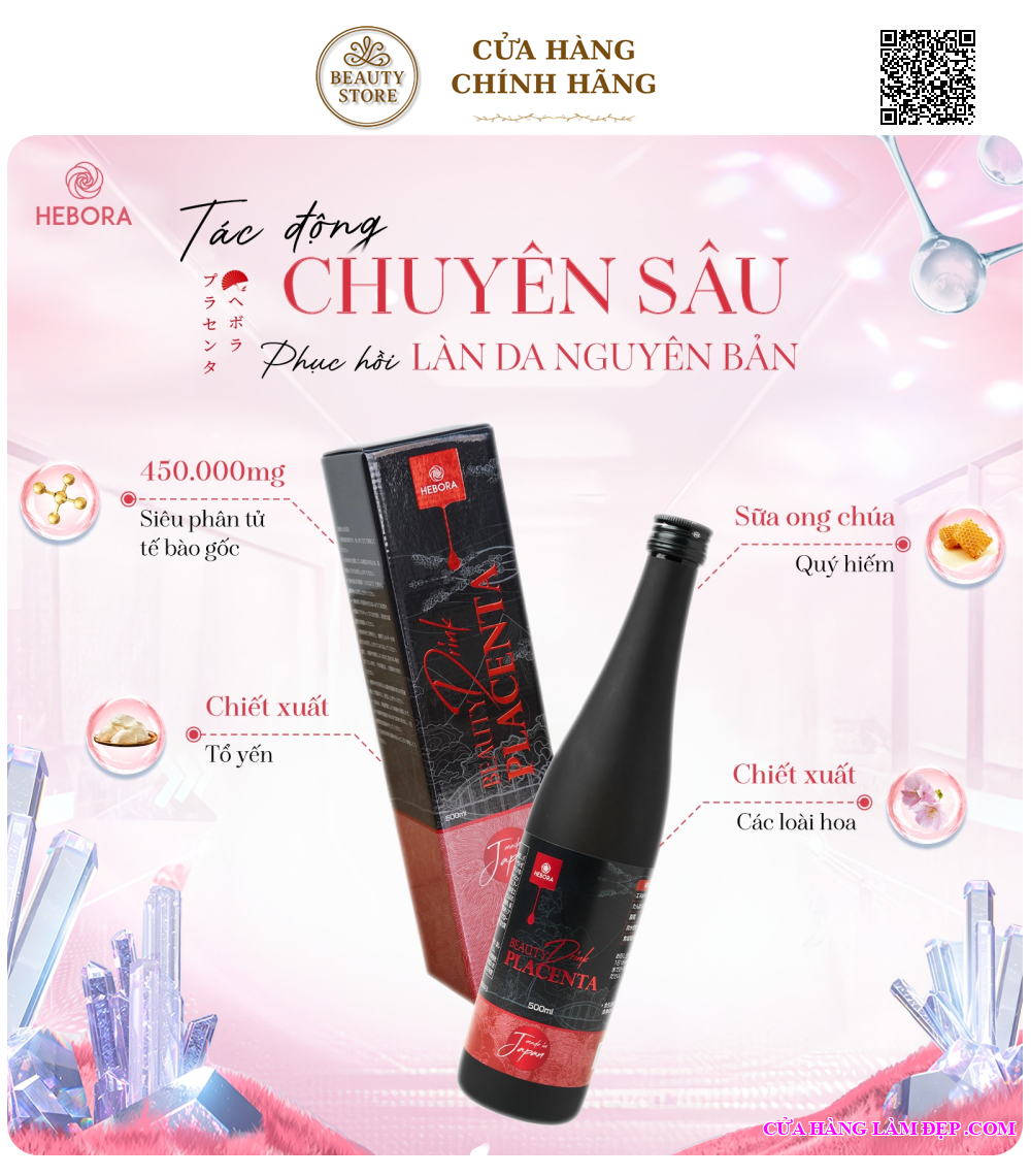 - Chính thức lộ diện siêu phẩm mới nhất, nước uống Tinh Chất Tế Bào nhau thai Hebora Nhật Bản – Beauty Drink Placenta, với chiết xuất từ Tinh Chất Tế Bào nhau thai heo với hàm lượng cao 450.000mg và tinh khiết hàng đầu thị trường, cùng chiết xuất tổ yến, Co-enzyme Q10 và nhiều thành phần thiên nhiên khác, Nước Uống Nhau Thai Hebora Beauty Drink Placenta không những mang đến khả năng hỗ trợ làm đẹp da mà còn giúp bổ sung dưỡng chất giúp duy trì làn da khỏe mạnh cho người sử dụng.