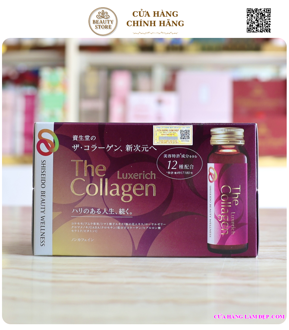 - The Collagen LuxeRich mẫu mới nhất 2024 của thương hiệu Shiseido cải tiến chất lượng với thành phần 12 dưỡng chất làm đẹp cao cấp, đột phá mới trong ngành hàng collagen với chứng nhận Bằng sáng chế số 4917180. Ngoài ra bổ sung thêm nhiều chiết xuất thiên nhiên mang đến làn da căng đầy, rạng rỡ.
