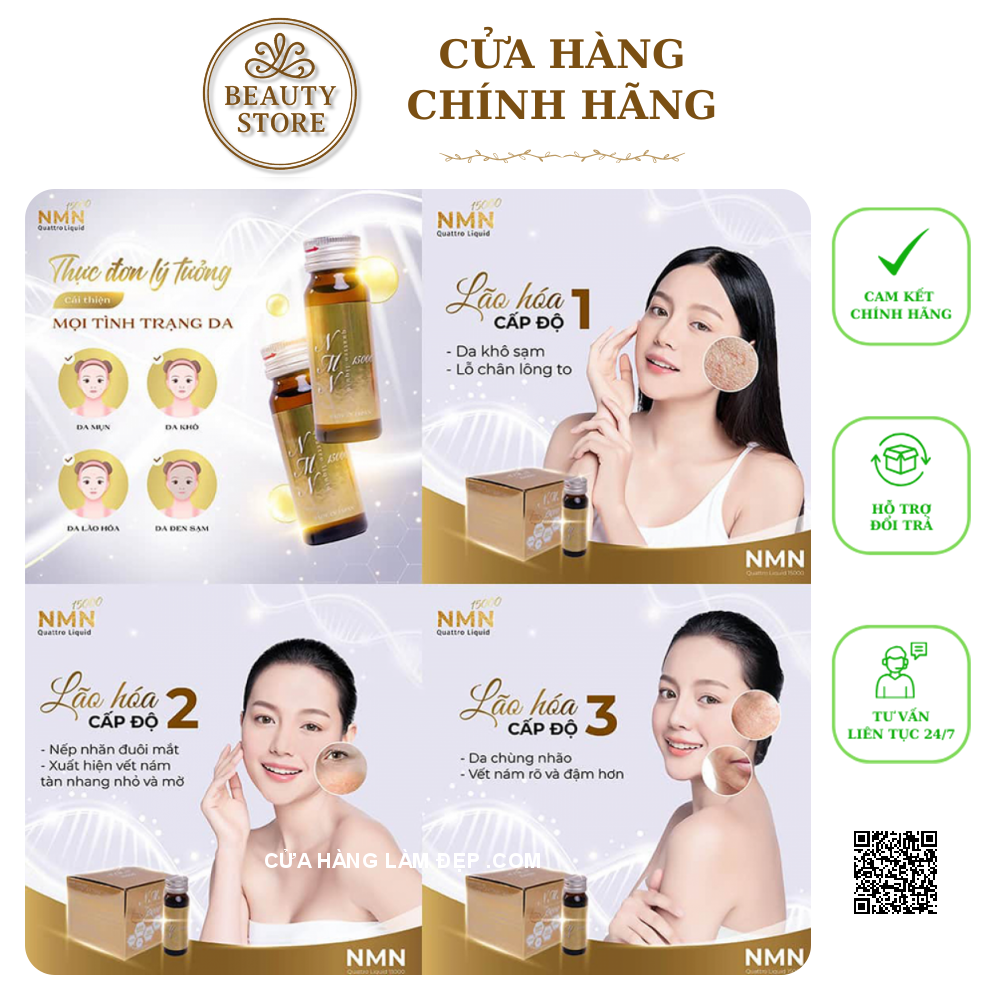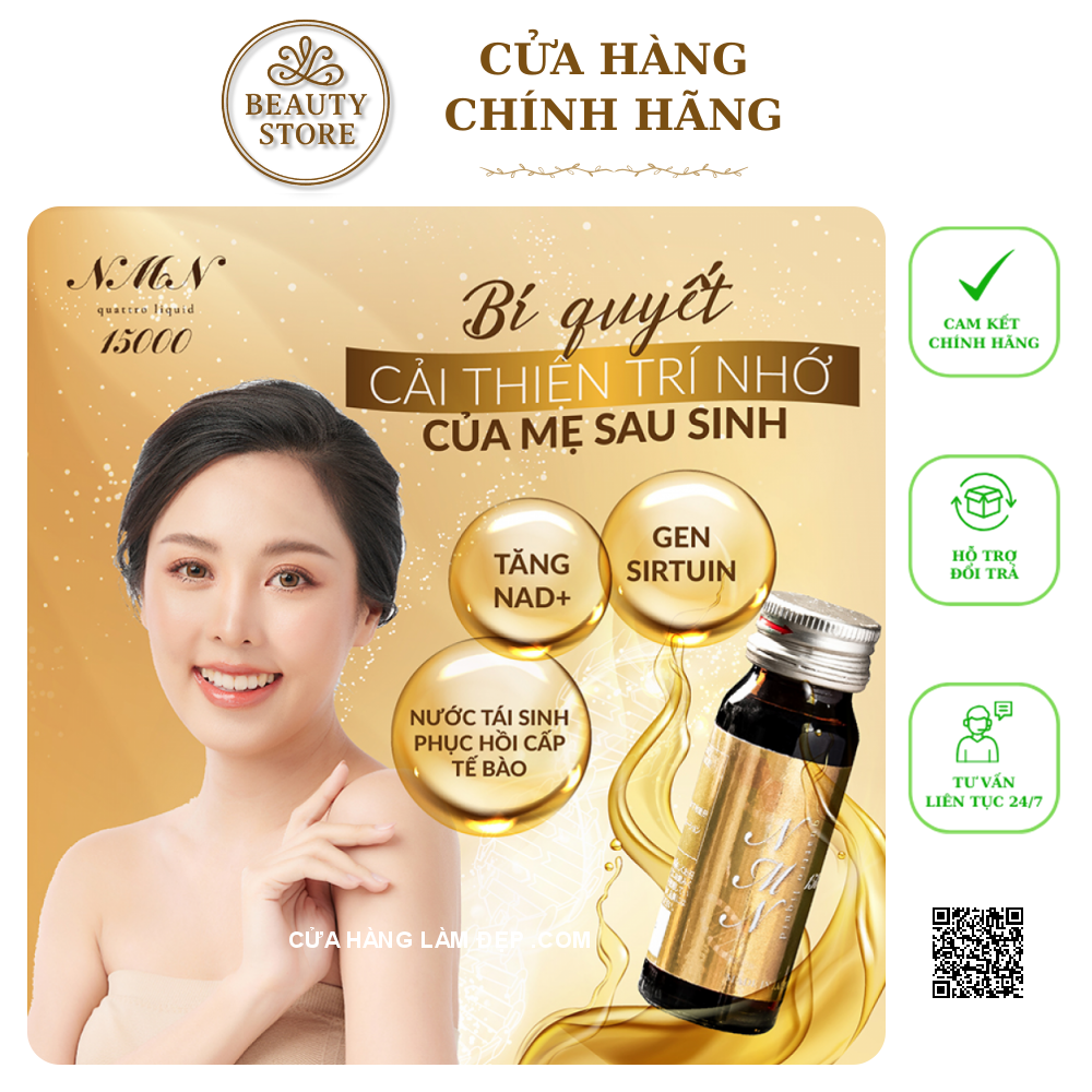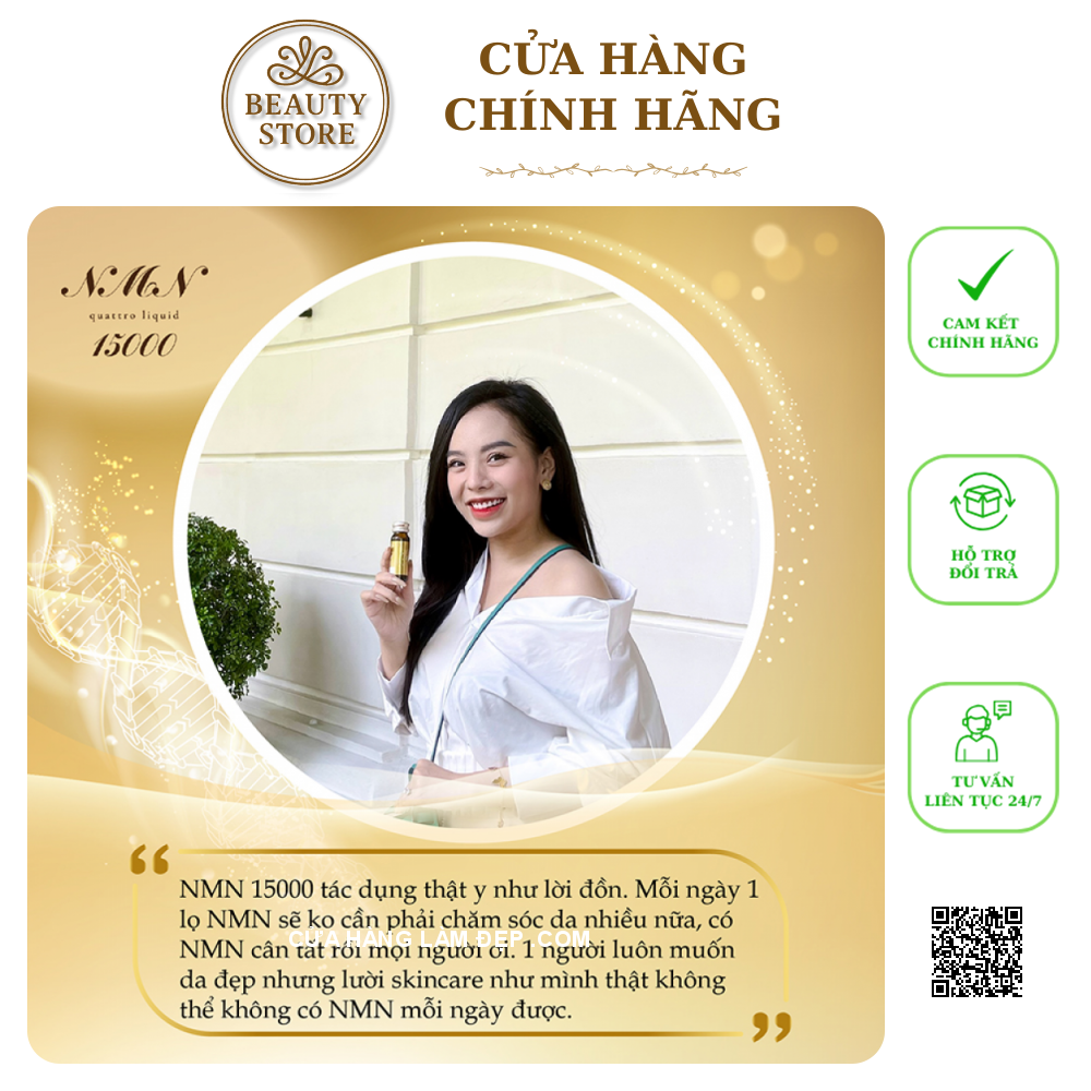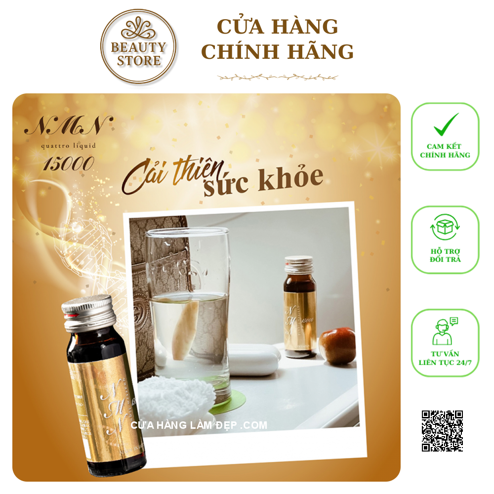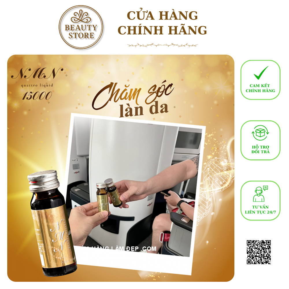 - Nước NMN Quatro Liquid 15000 được biết đến với khả năng làm đẹp, cải thiện làn da vô cùng tuyệt vời. Sản phẩm giúp làm tăng NAD+, kích hoạt gen Sirtuin, giảm các tác nhân gây hại cho da, chống lão hóa hiệu quả. - NMN giúp điều chỉnh và hình thành tế bào da, cải thiện các vấn đề về da lão hóa như nếp nhăn và chảy xệ. NMN dạng nước NMN Quattro Liquid 15000 là bí quyết lưu giữ tuổi thanh xuân cho bạn.
