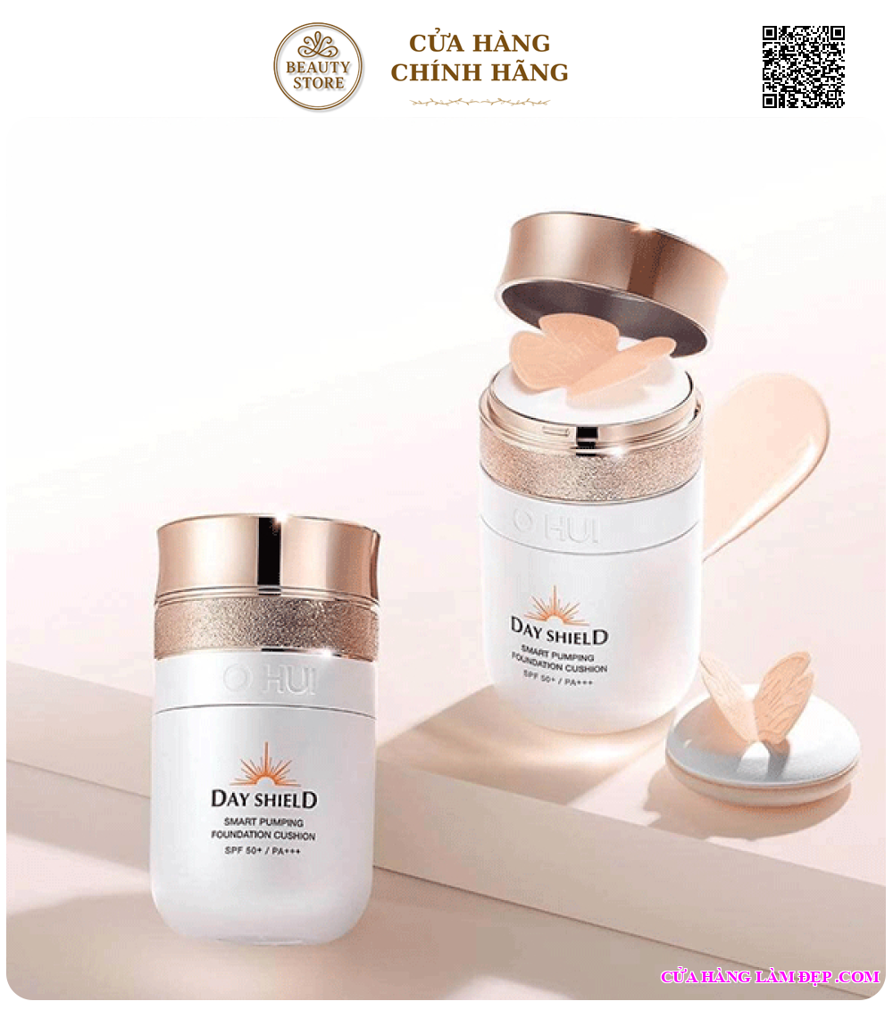 - Phấn Nước Day Shield Smart Pumping Foundation Cushion SPF 50+/ PA+++ Ohui là sản phẩm chống nắng dạng phấn cao cấp nhất trong dòng chuyên chống nắng Perfect Sun của OHUI. Với hiệu quả chống nắng và che khuyết điểm vượt trội. Hấp thụ chất nhờn giúp làn da ráo mịn không bóng nhờn khi trang điểm cùng khả năng bám dính cao.