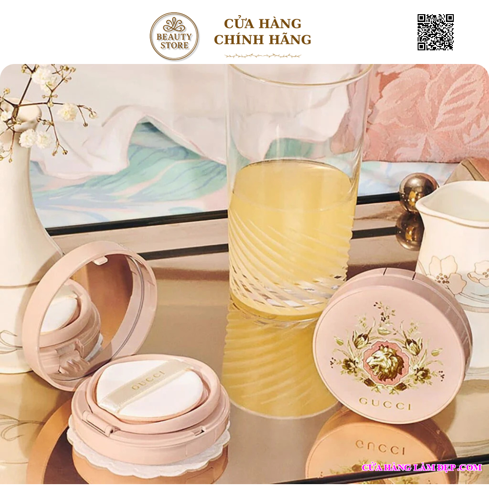 Gucci Beauty Cushion với công thức SPF 22/PA ++, đặc tính chống ô nhiễm và chống ánh sáng xanh giúp bảo vệ da khỏi ánh nắng mặt trời và các tác nhân bên ngoài khác và tăng cường dưỡng ẩm suốt cả ngày. Công thức cũng có lipochrome, chiết xuất từ dầu hoa hồng đen mang lại vẻ tự nhiên và mịn màng cho làn da.