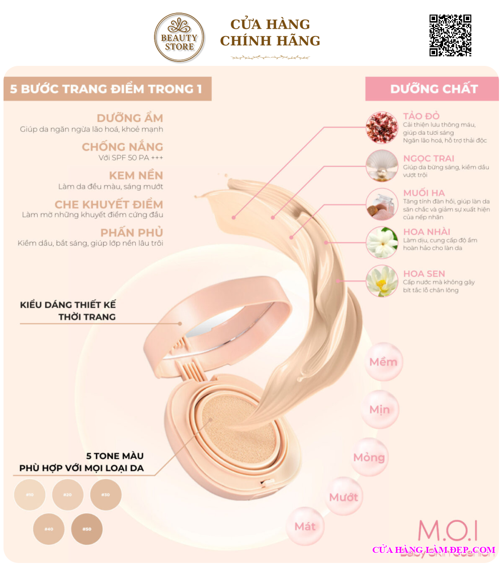- Phấn Nước MOI Baby Skin Cushion tiện ích 5 trong 1 với độ che phủ hoàn hảo hơn bởi kết cấu mỏng mịn, ôm khít vào bề mặt da cho lớp nền tự nhiên, mỏng mịn và căng mướt như làn da em bé.