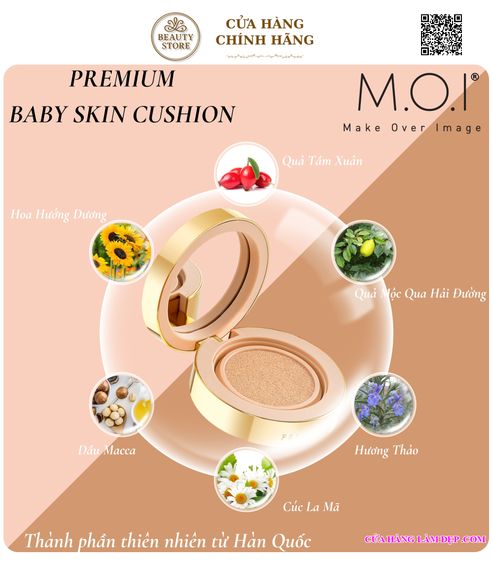 Phấn Nước M.O.I Premium Baby Skin Cushion là dòng phấn nước của M.O.I thuộc phiên bản đột phá với công nghệ cải tiến mới bởi thành phần gấp 3 lần dưỡng chất quý hiếm, giúp dưỡng da từ bên trong và làm đẹp từ bên ngoài tạo một lớp nền thật tự nhiên, mỏng mịn và căng mướt như làn da em bé.