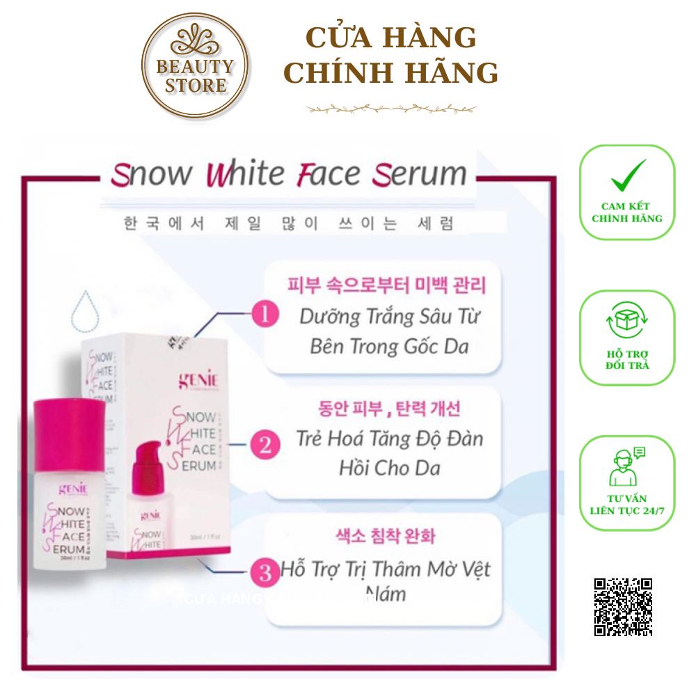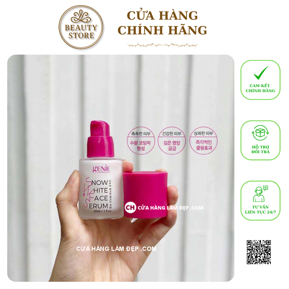 Tại Hệ thống Cửa hàng làm đẹp, Serum Bạch Tuyết Dưỡng Trắng Da Genie Snow White Face Serum có giá : 750.000VNĐ