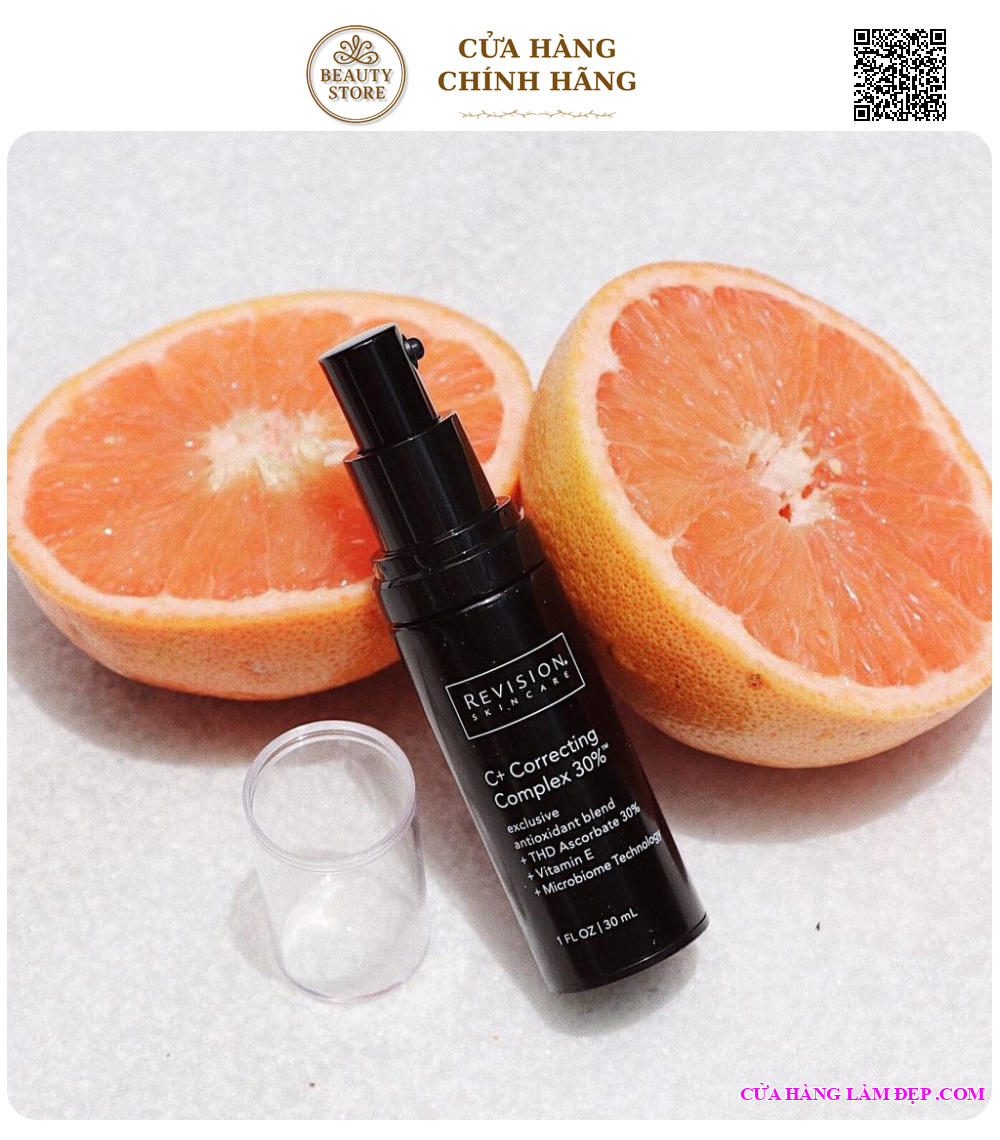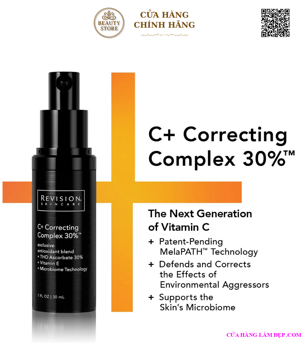 - Revision Skincare C+ Correcting Complex 30%® là phức hợp chống oxy hoá độc quyền từ Revision Skincare ứng dụng Công nghệ MelaPATH® đang chờ cấp bằng sáng chế. Sản phẩm giúp mang lại làn da sáng khoẻ rạng rỡ, đều màu và trẻ hoá. Bên cạnh cơ chế trẻ hoá vượt trội, bảo vệ và giảm thiểu các tác nhân gây tổn hại cho da như gốc tự do, ô nhiễm, ánh sáng khả kiến năng lượng cao (HEV và ánh sáng xanh) Revision Skincare C+ Correcting Complex 30%® còn sở hữu các công dụng ưu việt:
