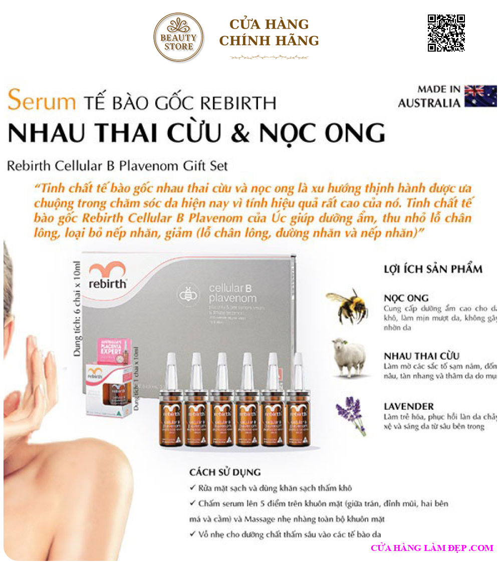 - Tinh chất Tinh Chất Tế Bào Rebirth Cellular B Plavenom của Úc giúp dưỡng ẩm cho da, thu nhỏ lỗ chân lông, làm mờ và loại bỏ hiệu quả các đường nhăn, nếp nhăn.