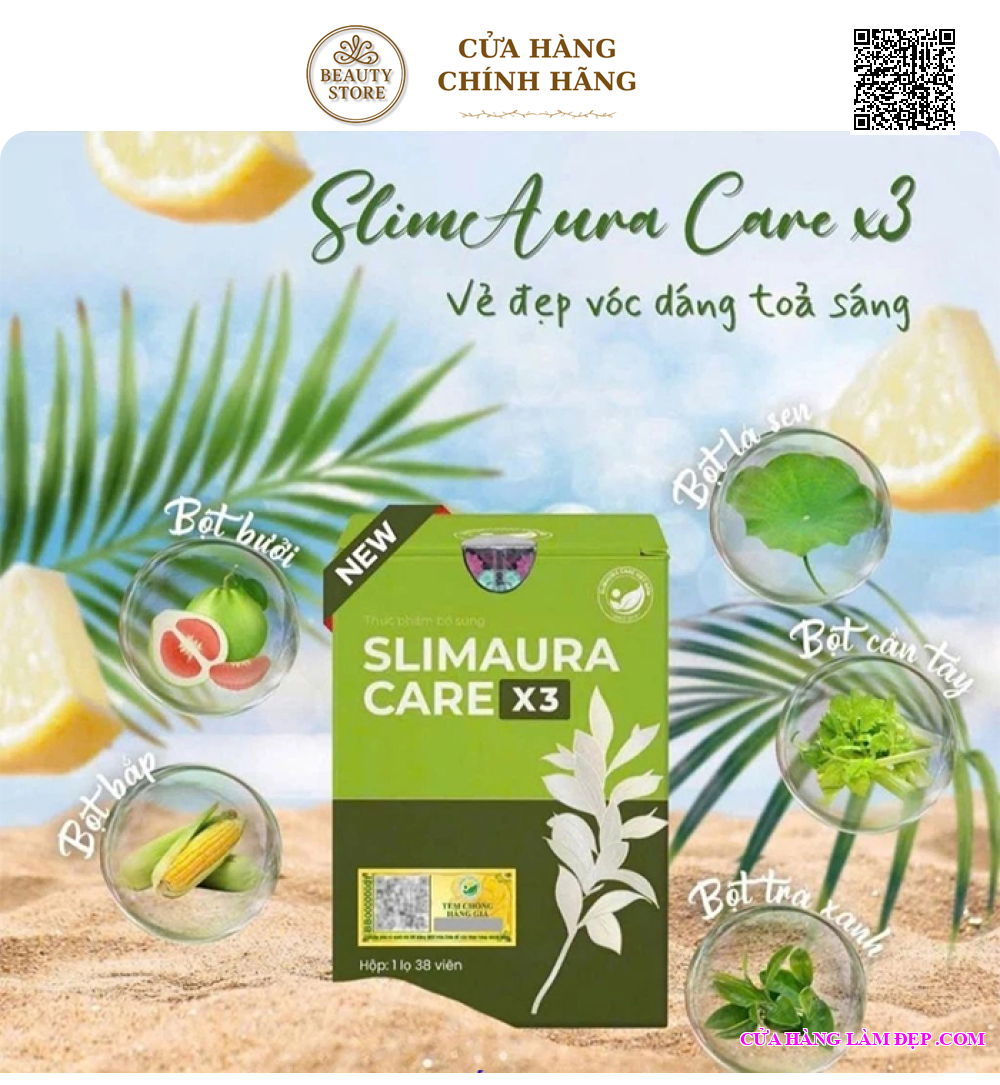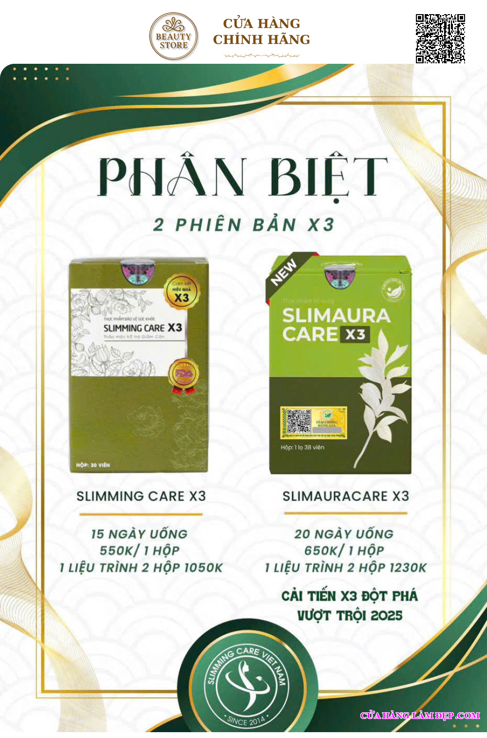SlimAura Care X3 là viên uống hỗ trợ giảm cân thế hệ mới đến từ thương hiệu Slimming Care Việt Nam, nổi bật với công thức cải tiến từ dòng Slimming Care X3 trước đó. Mỗi viên chứa hàm lượng cao các chiết xuất thảo mộc thiên nhiên cùng 9 loại collagen, Niacinamide, Adenosine và các hoạt chất hỗ trợ tiêu hóa, giúp kiểm soát cân nặng hiệu quả mà vẫn đảm bảo sức khỏe và làn da rạng rỡ.