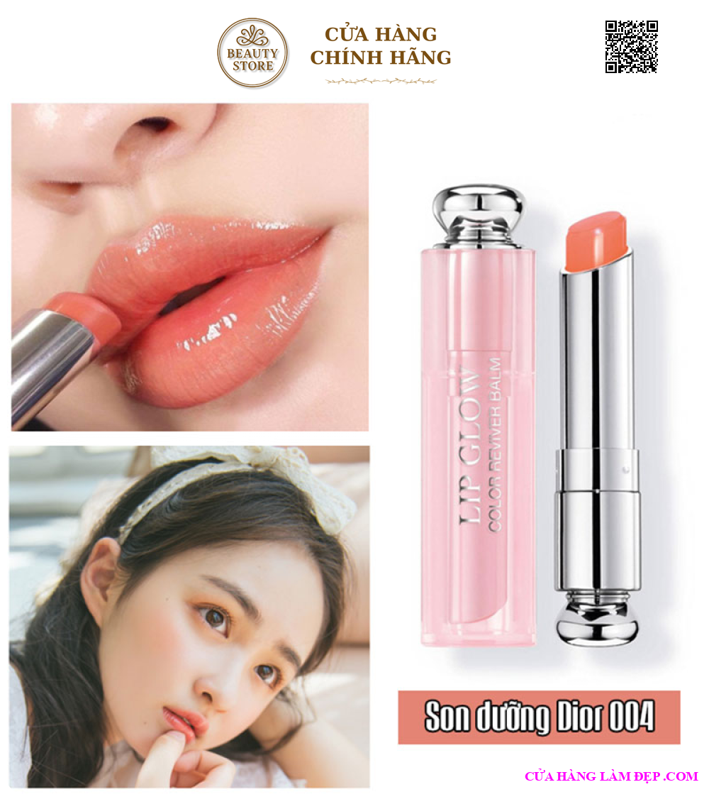 - Một trong những màu son hot nhất của Dior Lip Glow chính là son dưỡng Dior 004. Một tông cam san hô trong veo mang đến cảm giác bờ môi như muốn tan chảy. Màu son chẳng đậm nét chút nào mà vẫn khiến môi bừng sáng rạng ngời. Dùng son dưỡng dior 004 trải trên môi một lớn nền trong trẻo, mơ màng.