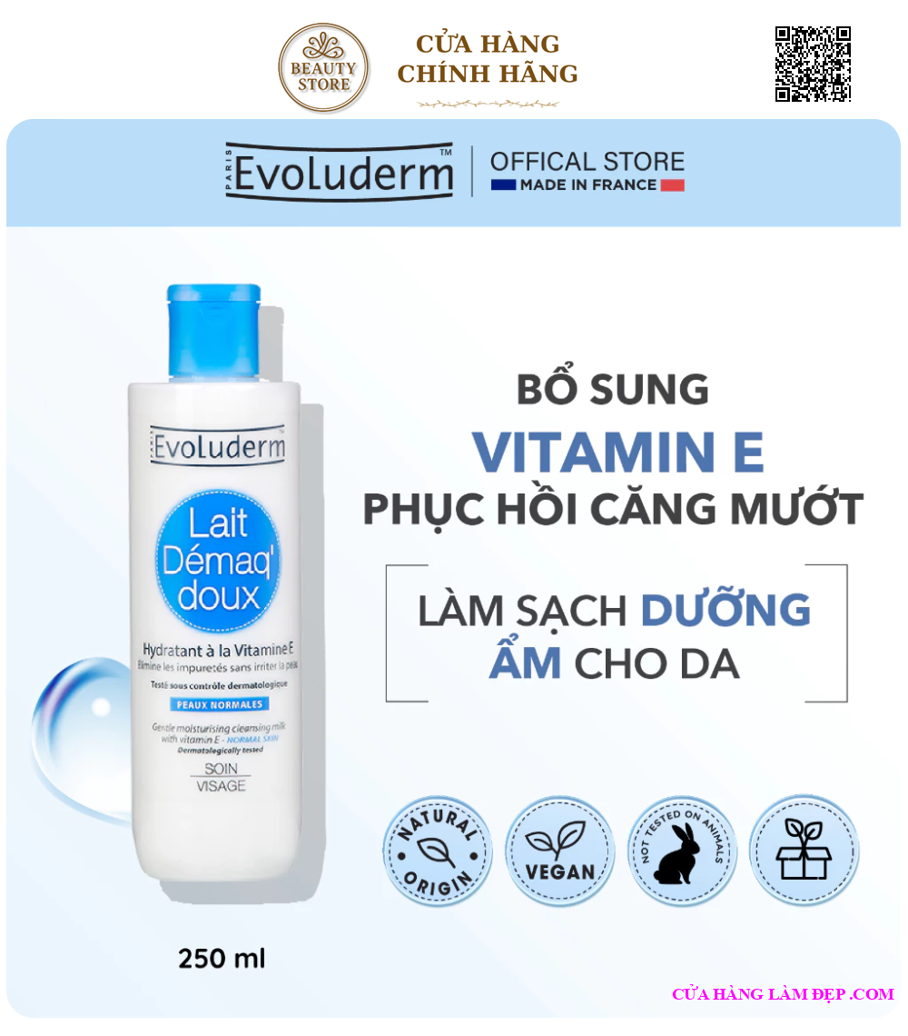 Tại hệ thống Cửa Hàng Làm Đẹp, sản phẩm Evoluderm Lait Demaq doux Sữa Rửa Mặt Tẩy Trang Hàng Ngày 250ml từ Pháp có giá 195.000 VNĐ