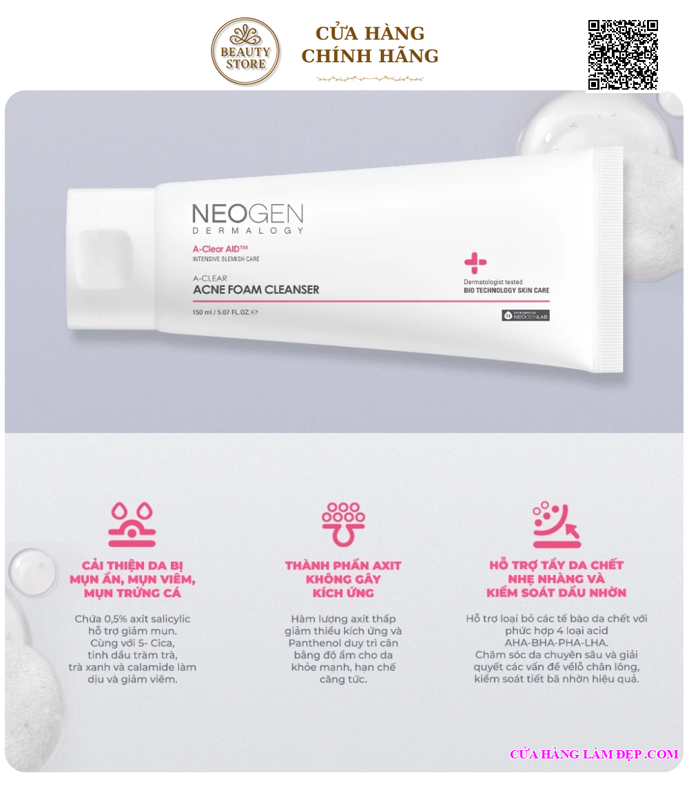 Sữa Rửa Mặt Neogen Dermalogy A-clear Acne Foam Cleanser Dạng Gel Làm Sạch Sâu Cho Da Dầu Mụn 150ml từ Hàn Quốc được khách hàng của Hệ Thống Cửa Hàng Làm Đẹp đánh giá cao.