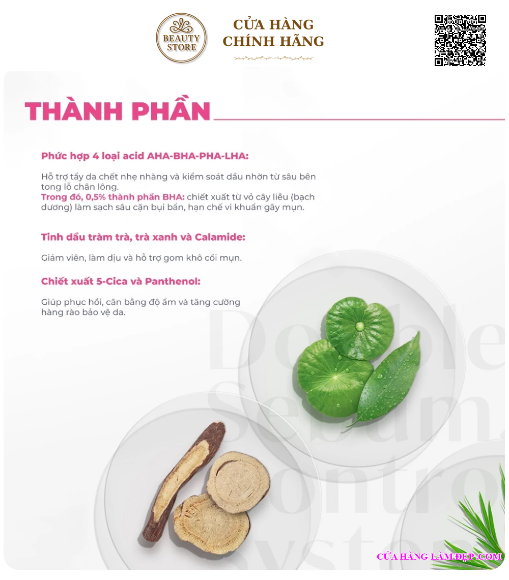AHA/BHA/PHA/LHA Complex: Tẩy tế bào chết nhẹ nhàng, làm sạch sâu lỗ chân lông, kiểm soát dầu nhờn hiệu quả.