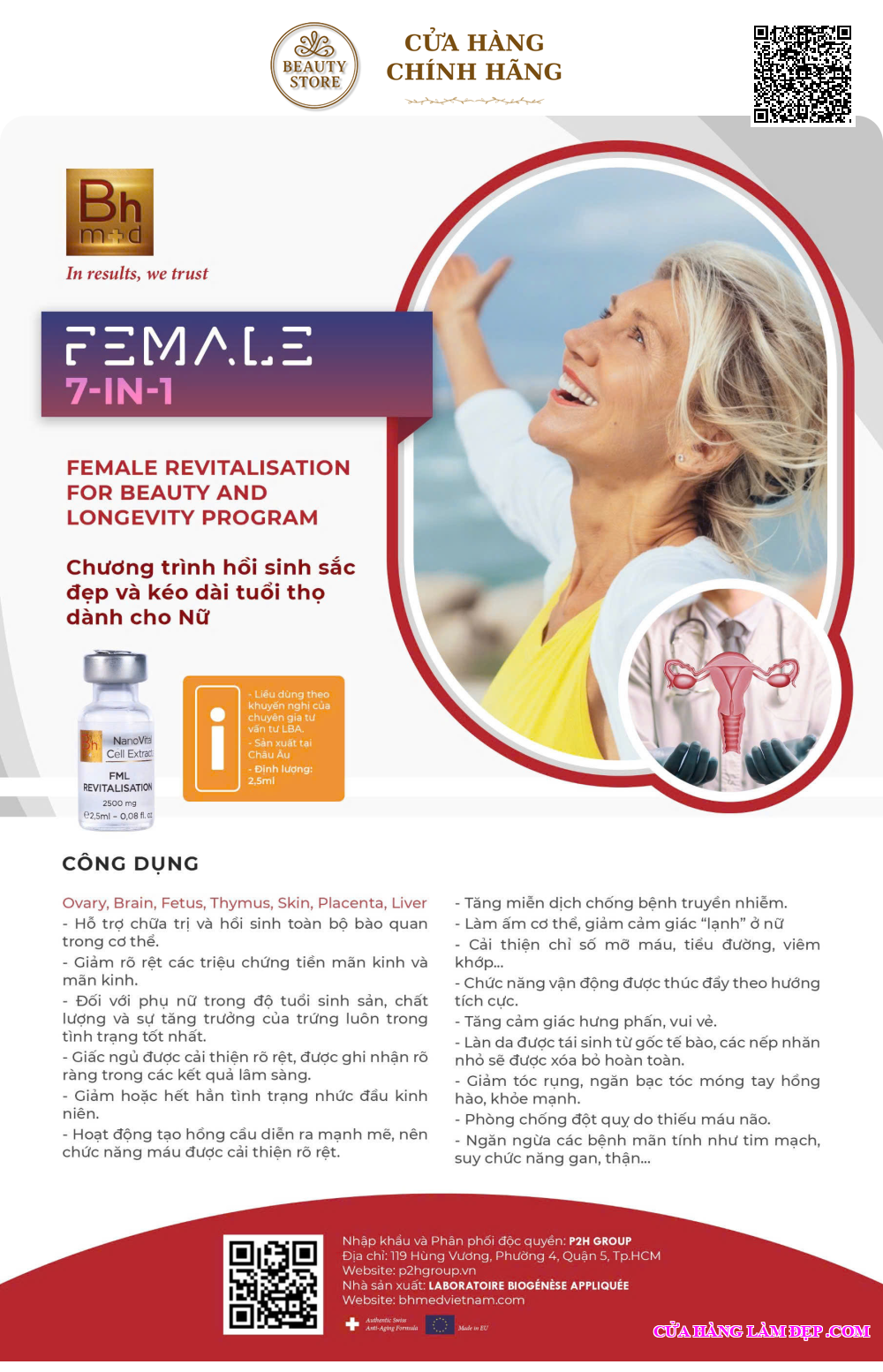 FEMALE REVITALISATION (7 in 1) là sản phẩm thuộc dòng NanoVital Cell Extracts của Bhmed Việt Nam, được nghiên cứu chuyên sâu nhằm “hồi sinh thanh xuân” cho phụ nữ. Sản phẩm kết hợp chiết xuất từ 7 cơ quan quan trọng: buồng trứng, trí não, sinh sản, tuyến ức, da, nhau thai và gan. Đây là giải pháp hỗ trợ toàn diện, giúp cải thiện chức năng tế bào, duy trì sức khỏe và sự trẻ trung lâu dài.
