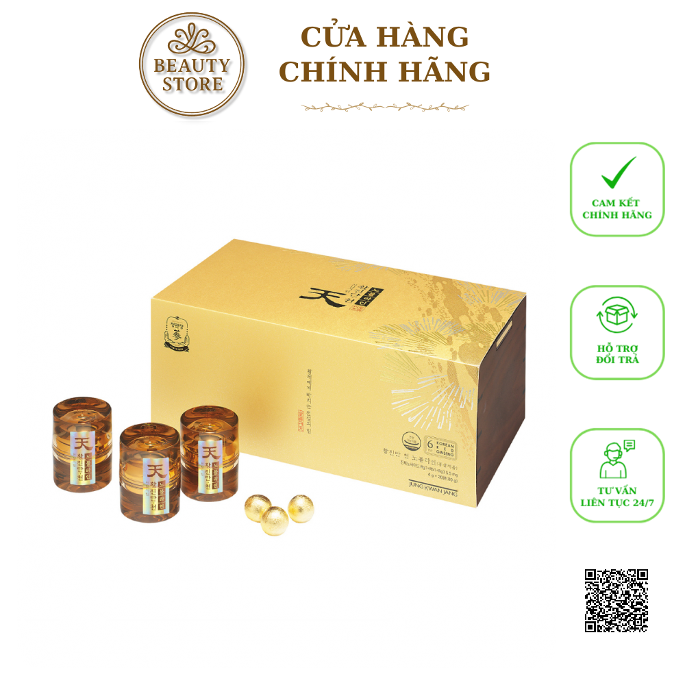 Thiên sâm linh đan KGC Jung Kwan Jang Hwang Jin Dan Cheon Noble Line là mẫu mới vừa được ra mắt hồi đầu tháng 7 - 2023, lần đầu tiên Viên linh đan Hwangjindan Cheon được phủ vàng lá ở trên bề mặt viên linh đan như một loại thực phẩm chức năng rất tốt cho sức khỏe.