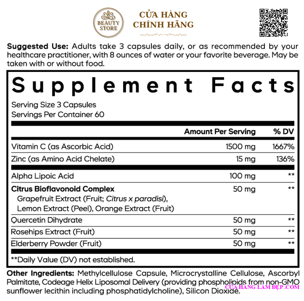 Phosphatidylcholine (từ Lecithin hoa hướng dương) – 450mg: Bảo vệ Vitamin C, tăng khả năng hấp thụ.