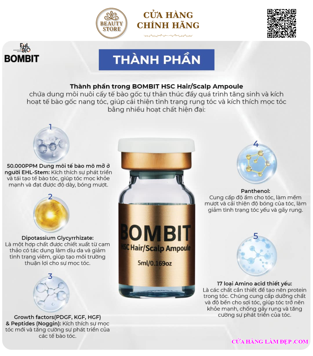 Bombit HSC Hair/Scalp Ampoule là dòng tinh chất chăm sóc tóc và da đầu cao cấp đến từ Hàn Quốc, ứng dụng công nghệ Tinh Chất Tế Bào hiện đại giúp kích thích mọc tóc, phục hồi nang tóc yếu và trẻ hóa da đầu. Sản phẩm đặc biệt phù hợp với người gặp tình trạng rụng tóc, tóc thưa, da đầu yếu hoặc sau điều giảm hóa chất.