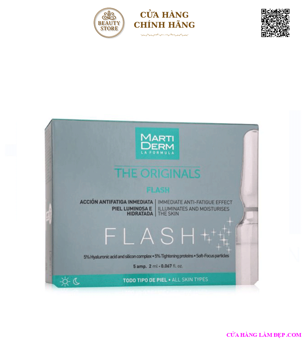 MartiDerm The Originals Flash là tinh chất cô đặc (ampoule) với công thức chống mệt mỏi tức thì cho làn da, giúp che giấu các khuyết điểm như nếp nhăn, mụn và tình trạng da xỉn màu thiếu sức sống, mang lại cho bạn một làn da rạng rỡ & tươi sáng ngay sau khi sử dụng.