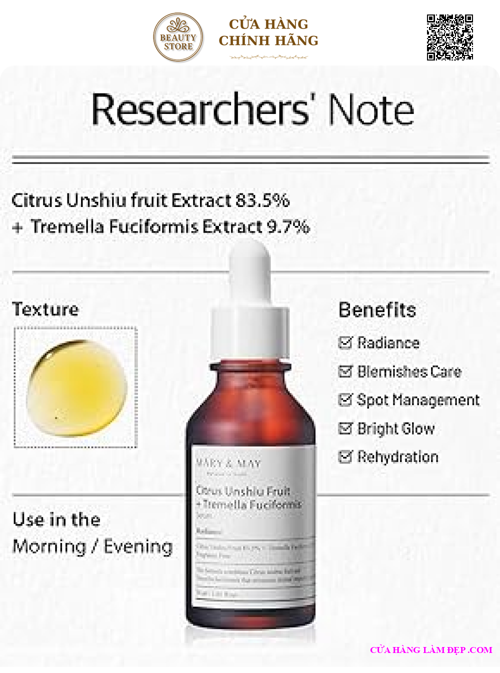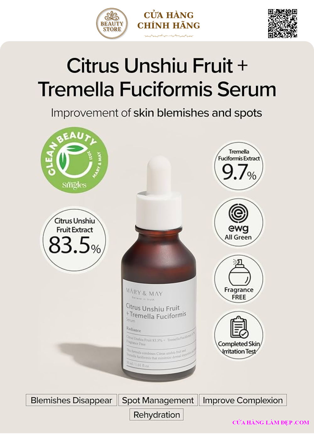 Với công thức kết hợp chiết xuất trái quýt Unshiu và nấm tuyết Tremella Fuciformis, serum này tập trung vào khả năng làm sáng da, đều màu da và cấp ẩm sâu. Sản phẩm có kết cấu mỏng nhẹ, thấm nhanh, không gây bết dính và phù hợp với mọi loại da, kể cả da nhạy cảm.