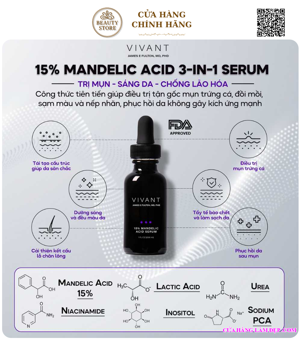 15% Mandelic Acid Serum – Công thức mạnh mẽ nhắm đến mục tiêu điều giảm mụn trứng cá, đồi mồi, sạm nám và nếp nhăn. Với 15% Mandelic Acid, sản phẩm giúp tái tạo cấu trúc và phục hồi da hiệu quả nhưng không gây kích ứng mạnh hoặc tăng sắc tố sau viêm.