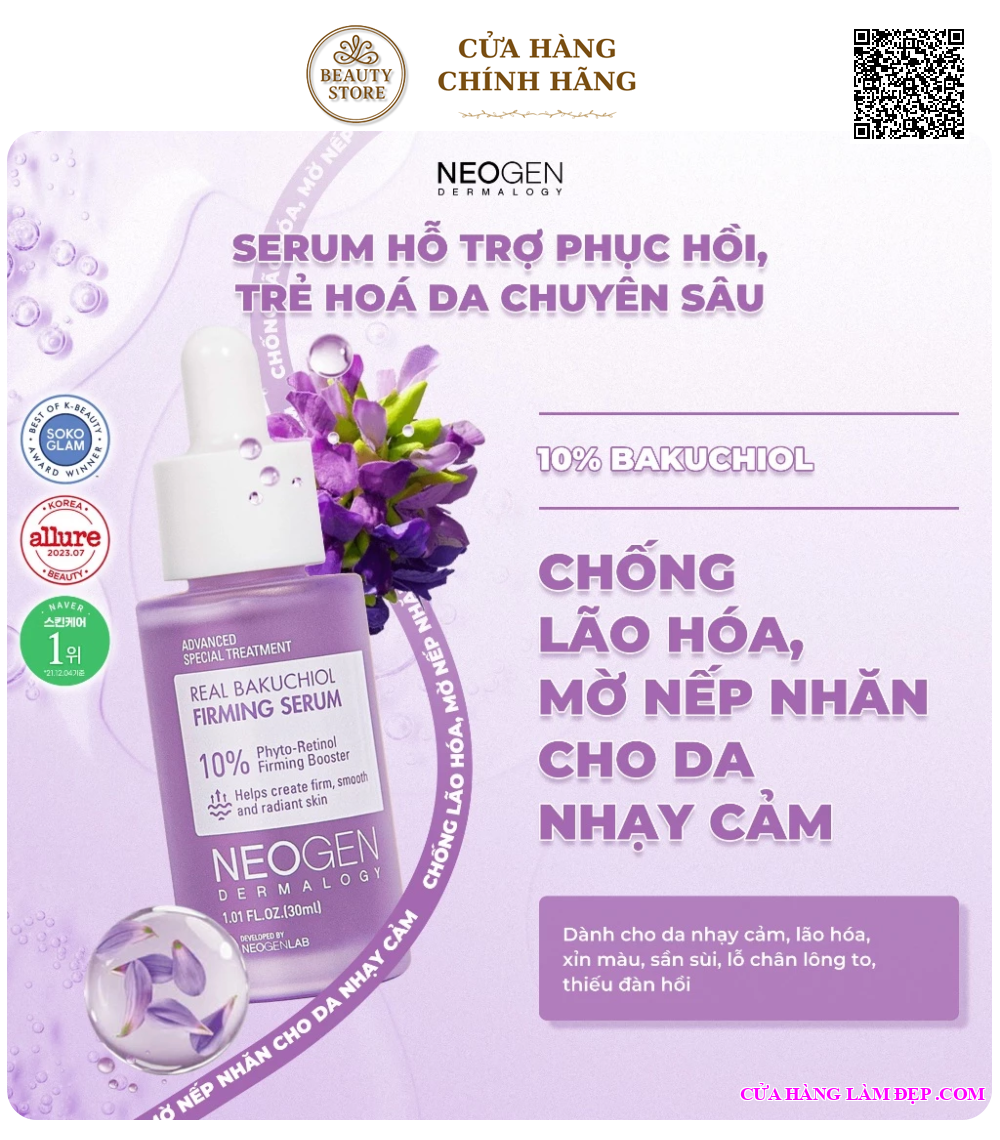 Serum Neogen Dermalogy Real Bakuchiol Firming là tinh chất Hỗ Trợ Ngừa Lão Hóa thế hệ mới đến từ thương hiệu Neogen Dermalogy – Hàn Quốc, nổi tiếng với các sản phẩm chăm sóc da ứng dụng công nghệ sinh học tiên tiến. Với nồng độ 10% Bakuchiol sinh học – hoạt chất thực vật được mệnh danh là “retinol tự nhiên”, sản phẩm giúp làm mờ nếp nhăn, cải thiện độ đàn hồi và làm sáng da một cách dịu nhẹ, không gây kích ứng.