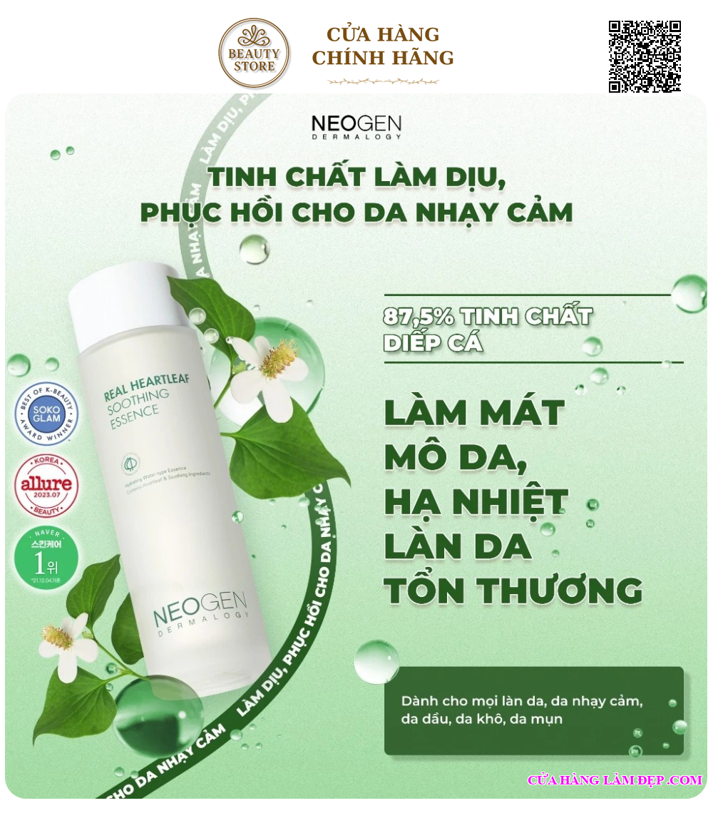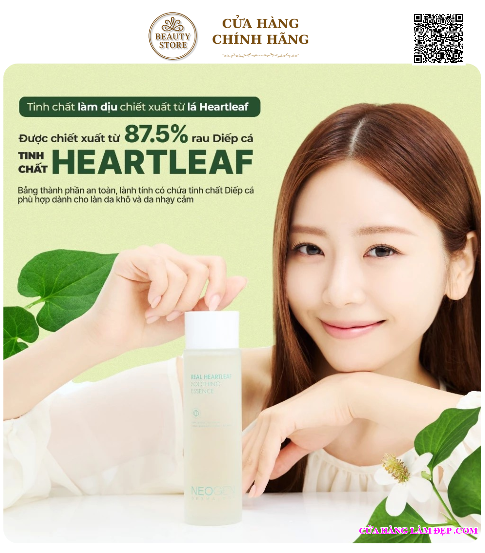 Tinh chất Neogen Dermalogy Real Heartleaf Soothing Essence là sản phẩm chăm sóc da dịu nhẹ đến từ thương hiệu Neogen Dermalogy – Hàn Quốc, nổi tiếng với các dòng mỹ phẩm ứng dụng chiết xuất thực vật và công nghệ sinh học tiên tiến. Với thành phần chính là chiết xuất diếp cá (Heartleaf) tinh khiết, sản phẩm giúp làm dịu da, giảm kích ứng và phục hồi da nhạy cảm một cách hiệu quả.