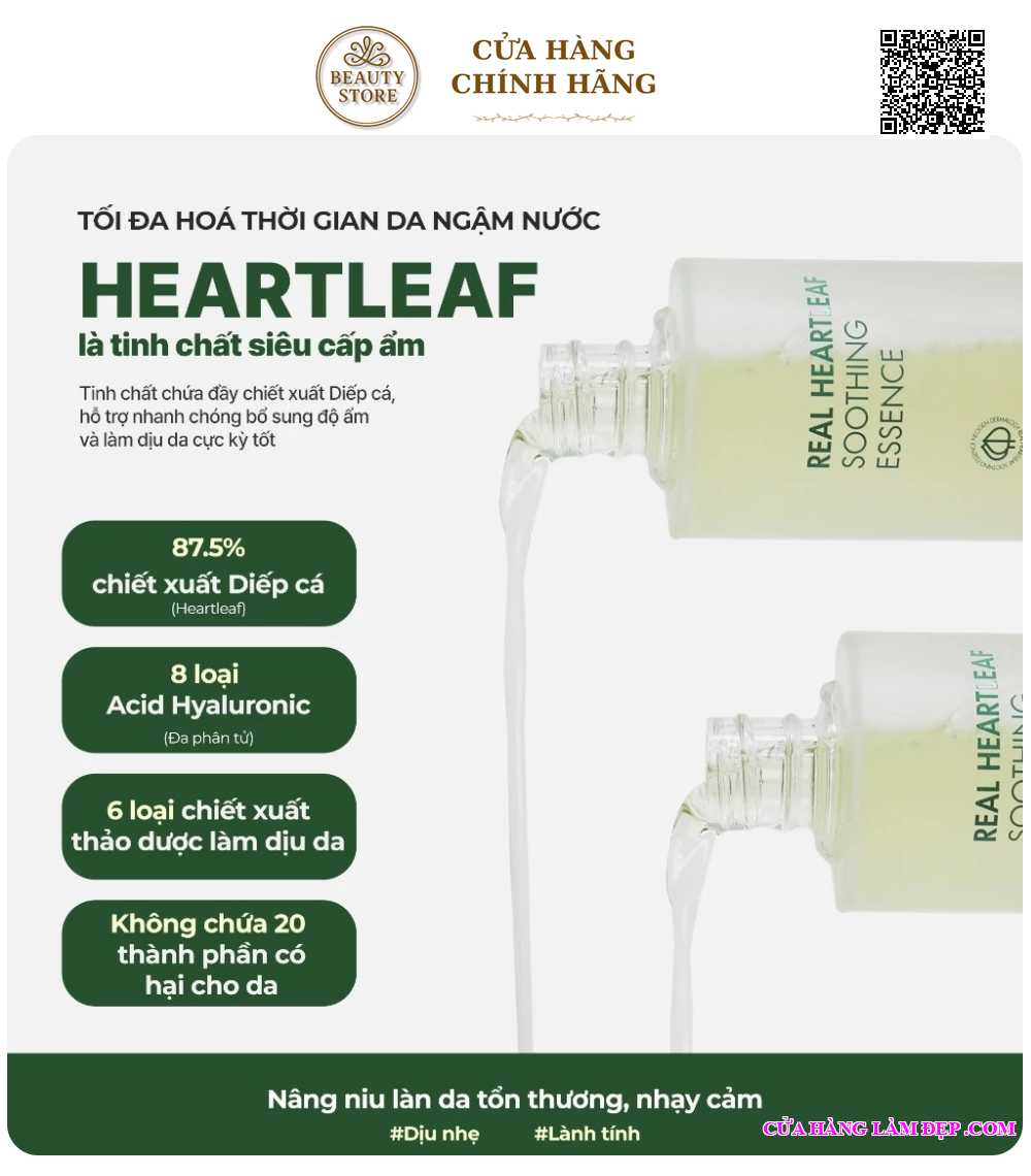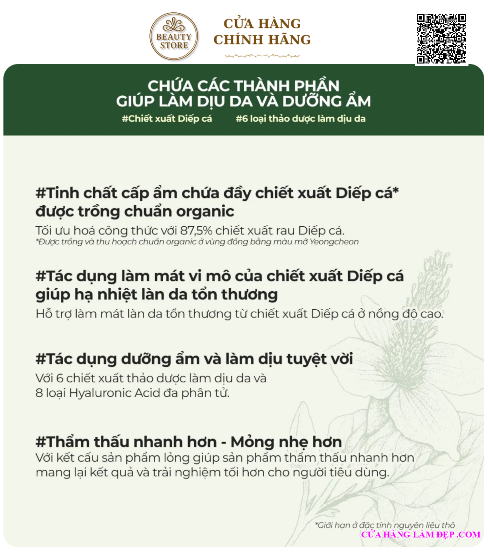 Chiết xuất diếp cá (Heartleaf Extract): Làm dịu da, kháng viêm, hỗ trợ giảm mụn và phục hồi vùng da tổn thương.