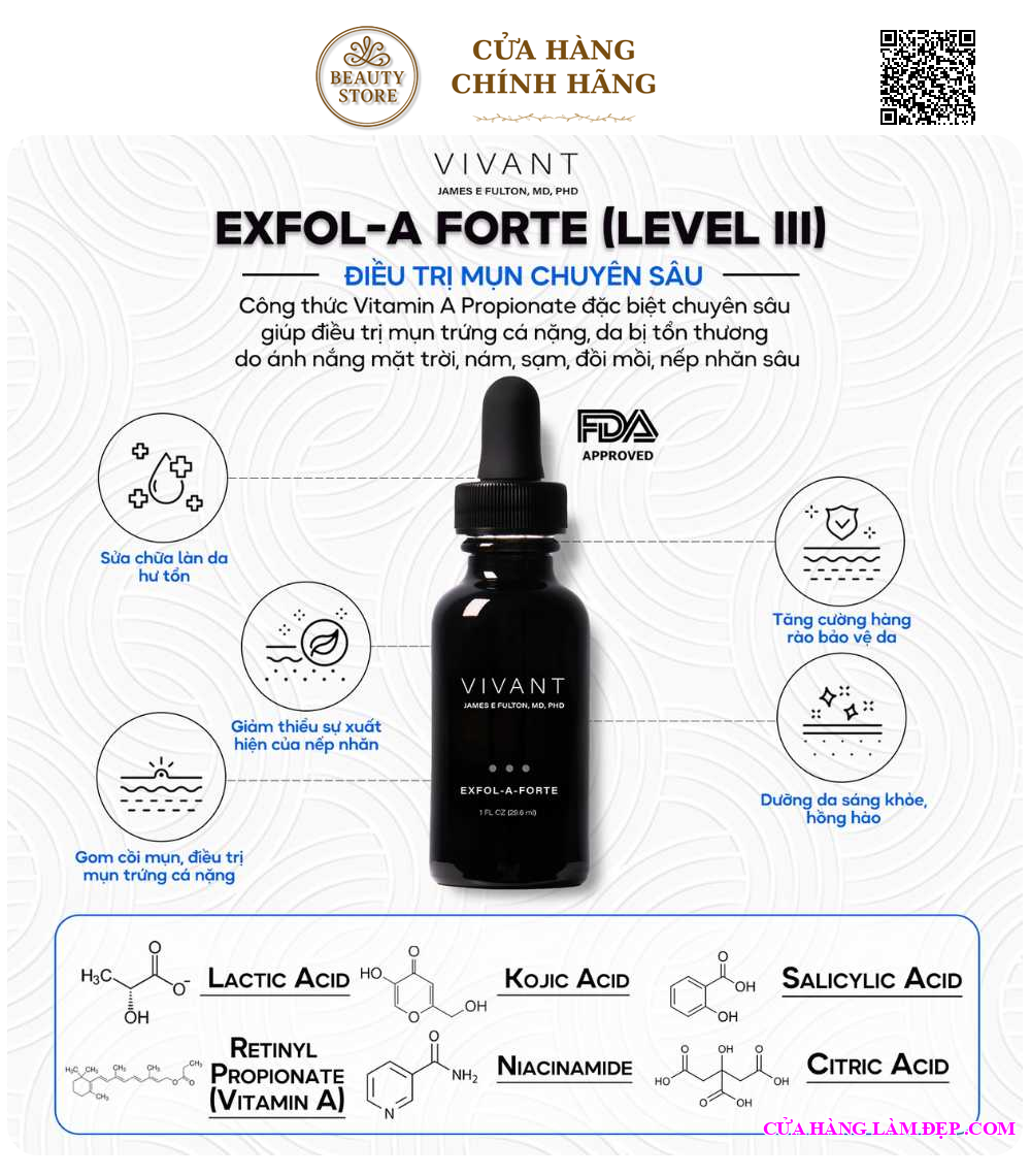Exfol-A Forte – Giải pháp tái tạo da chuyên sâu nhất trong các liệu pháp Vitamin A được cấp bằng sáng chế của Vivant Skincare, kết hợp AHA mang đến kết quả tẩy tế bào chết vượt trội và điều Giảm Mụn trứng cá mạnh mẽ.