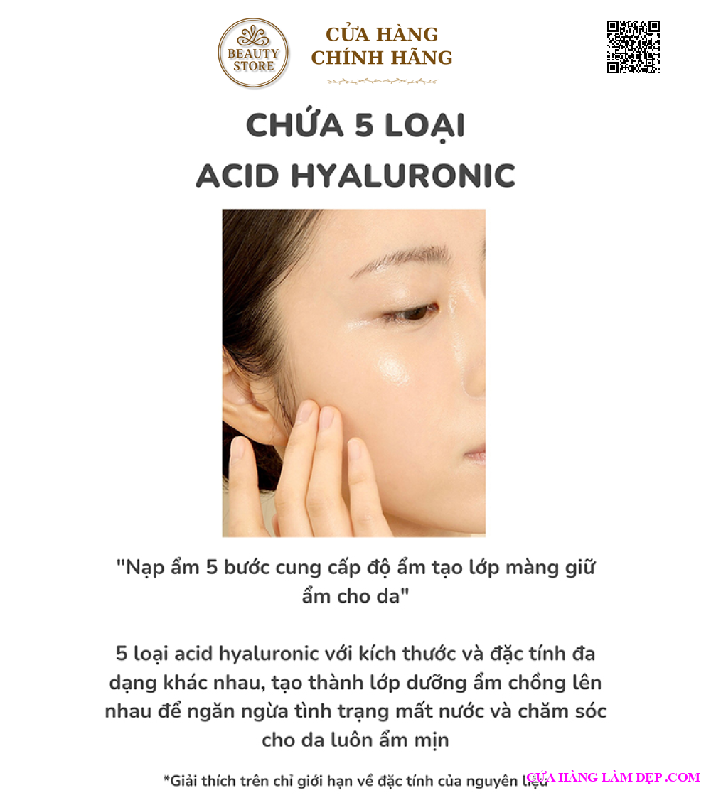 - Tăng cường độ ẩm hiệu quả với 5 loại Hyaluronic Acid.