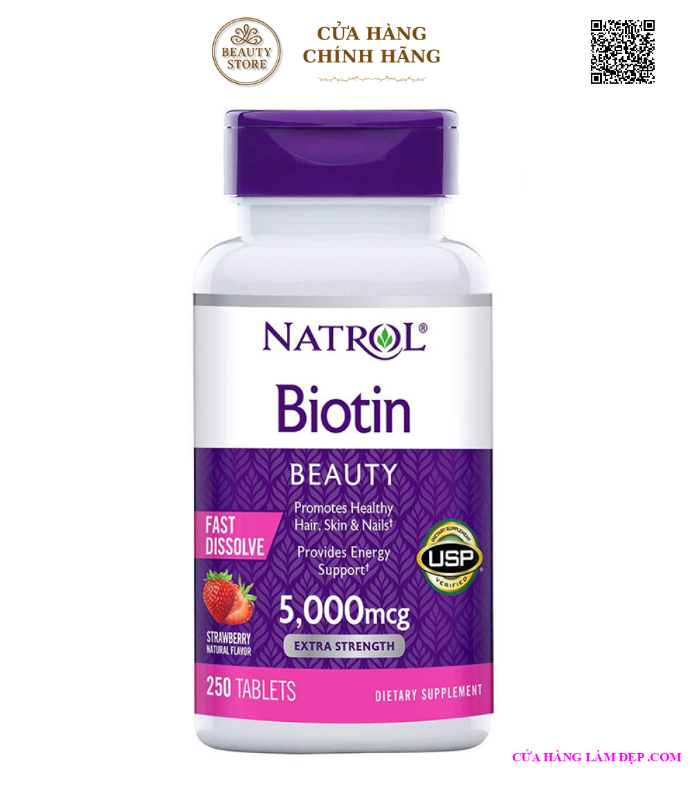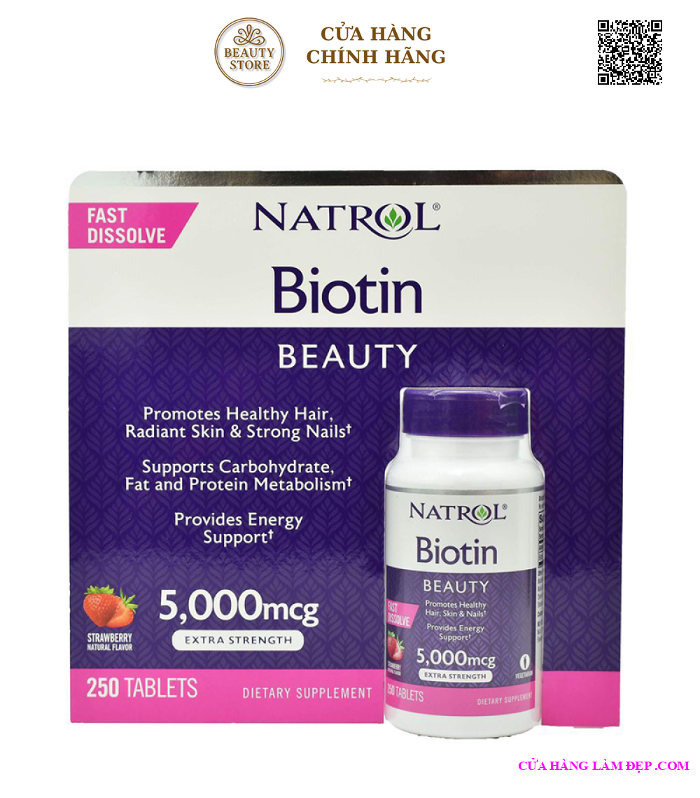 - Viên uống Natrol Biotin Beauty 5000mcg 250 viên của Mỹ bổ sung Biotin cần thiết cho cơ thể, hỗ trợ điều trị mụn trứng cá, làm da láng mịn tự nhiên, sắc da tươi tắn hơn, giảm vết thâm nám, giảm các tình trạng viêm da, trả lại cho bạn một làn da khỏe mạnh, tươi sáng, tràn đầy sức sống. - Biotin làm giảm lượng tóc rụng, kích thích mọc tóc, ngăn chặn hói đầu, đem lại cho bạn một da đầu khỏe mạnh, mái tóc dày, chắc khỏe từ gốc đến ngọn và mềm mượt. Sản phẩm cực kỳ tuyệt vời cho những người bị hói đầu. - Biotin làm tăng sức sống cho móng tay, móng chân, nuôi dưỡng hệ móng chắc khỏe, tránh bị giòn, gãy. - Viên ngậm hương dâu Natrol Biotin Beauty 5000mcg Extra Strength làm giảm nhanh các triệu chứng viêm da: viêm da tiết bã nhờn, viêm da chân lông,... cho làn da khỏe mạnh, mịn màng. - Natrol Biotin Beauty 5000mcg có tác dụng hỗ trợ chuyển đổi thực phẩm thành năng lượng, vì vậy bạn sẽ luôn cảm thấy khỏe khoắn, giảm các triệu chứng về thần kinh như: Mất ngủ, Stress, buồn nôn, trầm cảm,... - Một số nghiên cứu còn cho thấy Biotin có thể cải thiện đường trong máu, hỗ trợ điều trị tiểu đường loại 2.