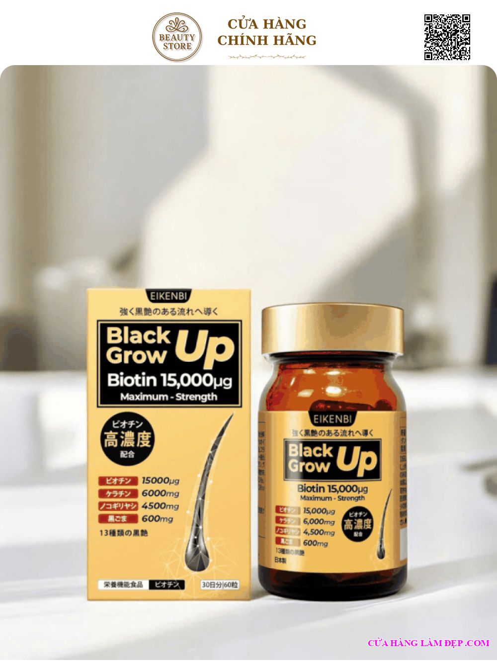 Viên Uống Mọc Tóc & Đen Tóc Black Grow Up Maximum Biotin 15,000µg Eikenbi là giải pháp chăm sóc tóc toàn diện đến từ Nhật Bản, giúp cải thiện các vấn đề về rụng tóc, tóc mỏng, hói đầu và tóc bạc sớm. Sản phẩm nổi bật với hàm lượng Biotin cao lên đến 15,000µg – mức cao nhất trên thị trường, kết hợp cùng Keratin 6,000mg, dầu cọ lùn (Saw Palmetto), vừng đen và các dưỡng chất quý như Collagen, Gừng đen, Vitamin E, hỗ trợ kích thích mọc tóc mới, phục hồi tóc hư tổn và duy trì màu tóc đen bóng tự nhiên.