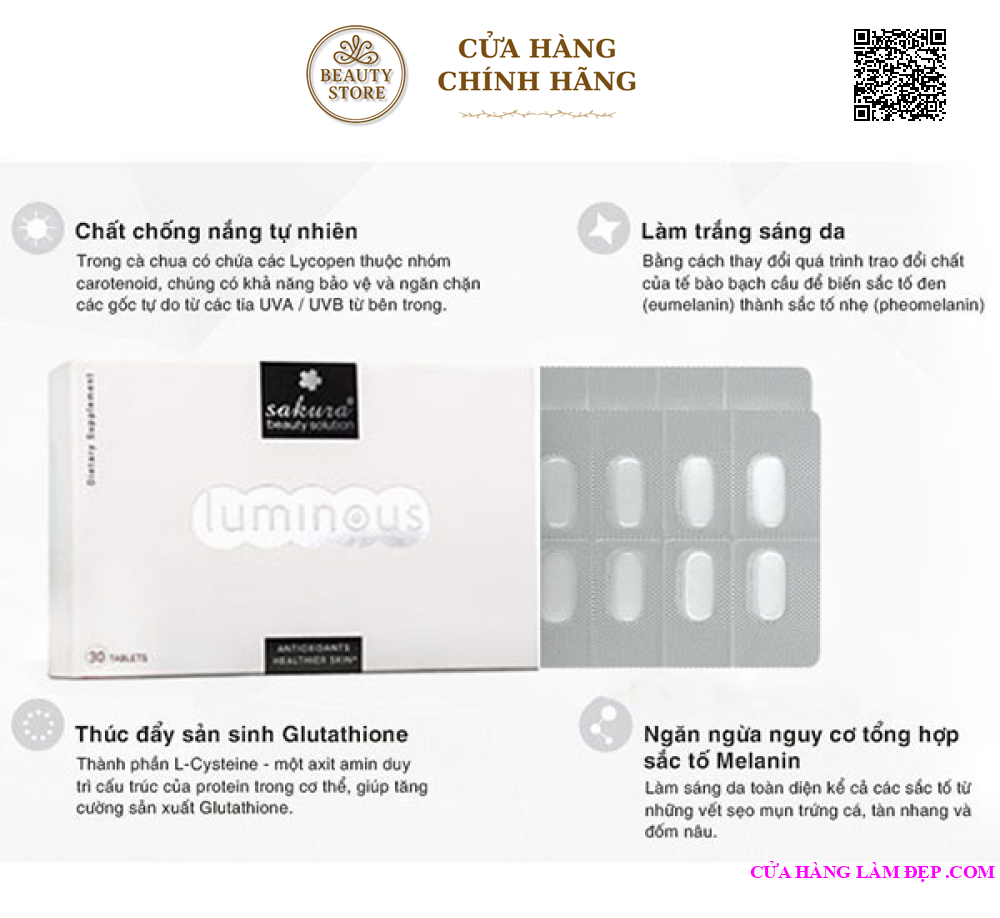 - Với thành phần nguồn gốc thiên nhiên lành tính và không gây tác dụng phụ, Sakura Luminous giúp chị em sớm sở hữu một làn da trắng khỏe từ sâu bên trong.